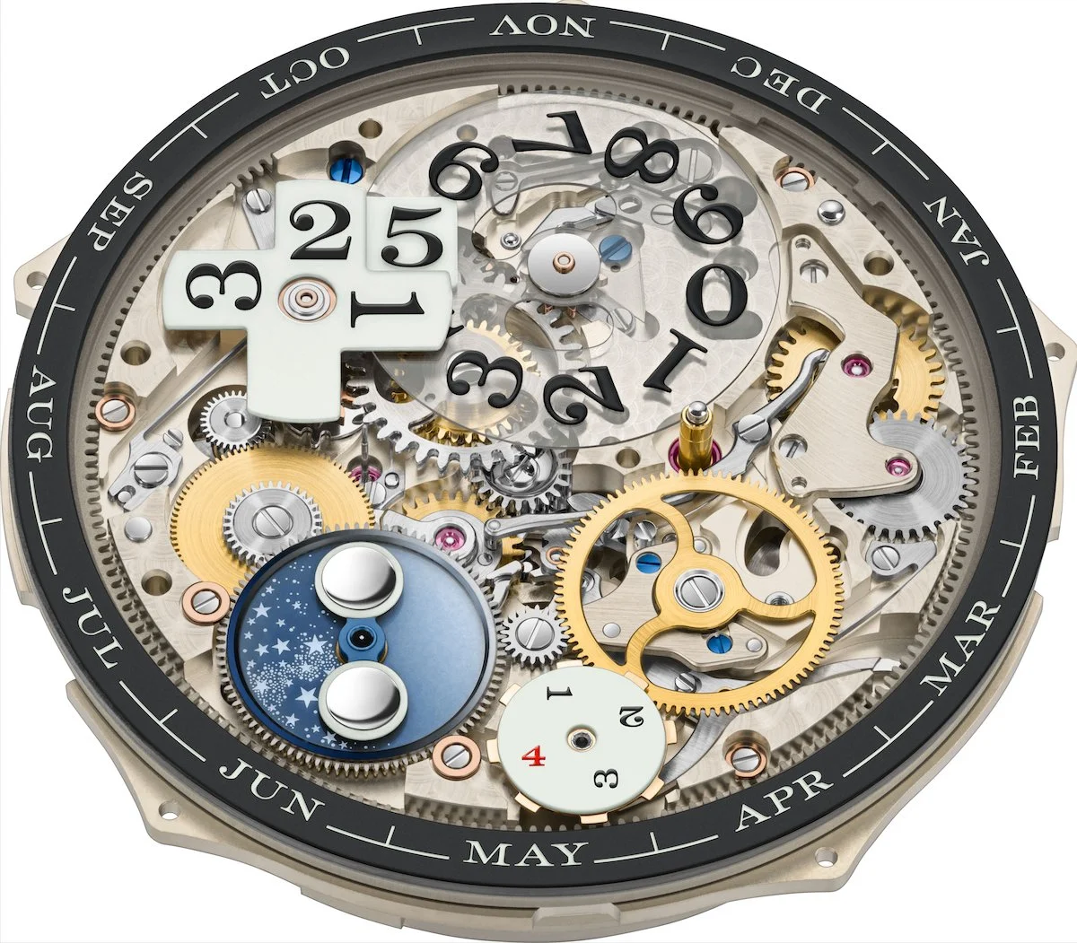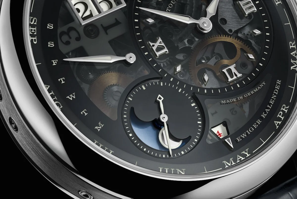 The dial is sapphire crystal, coated to allow UV light to continuously charge the luminous compound beneath — a constructive necessity that also makes the movement visible. The result is a watch that reads differently by day and by night, with larger elements like the outsize date and leap-year display glowing more intensely than the finer hands and scales, creating a hierarchy of light rather than a uniform wash. The peripheral month ring replaces the conventional aperture display, and all calendar indications switch instantaneously.