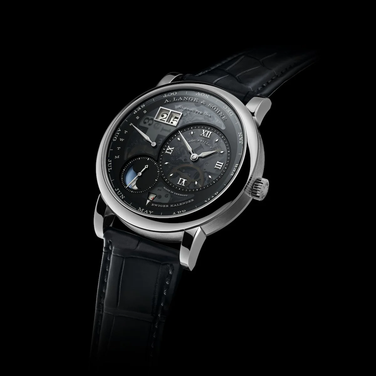 Barring interruption, the calendar requires no manual correction until 1 March 2100. The moon-phase display debuts an integrated day/night indication: a celestial disc rotating once per 24 hours shows a star-filled sky after dark and a clear sky during daylight. Accuracy is one day's deviation per 122.6 years. The 41.9mm platinum case contrasts sharply against the dark dial and black hand-stitched alligator strap with platinum deployant buckle.