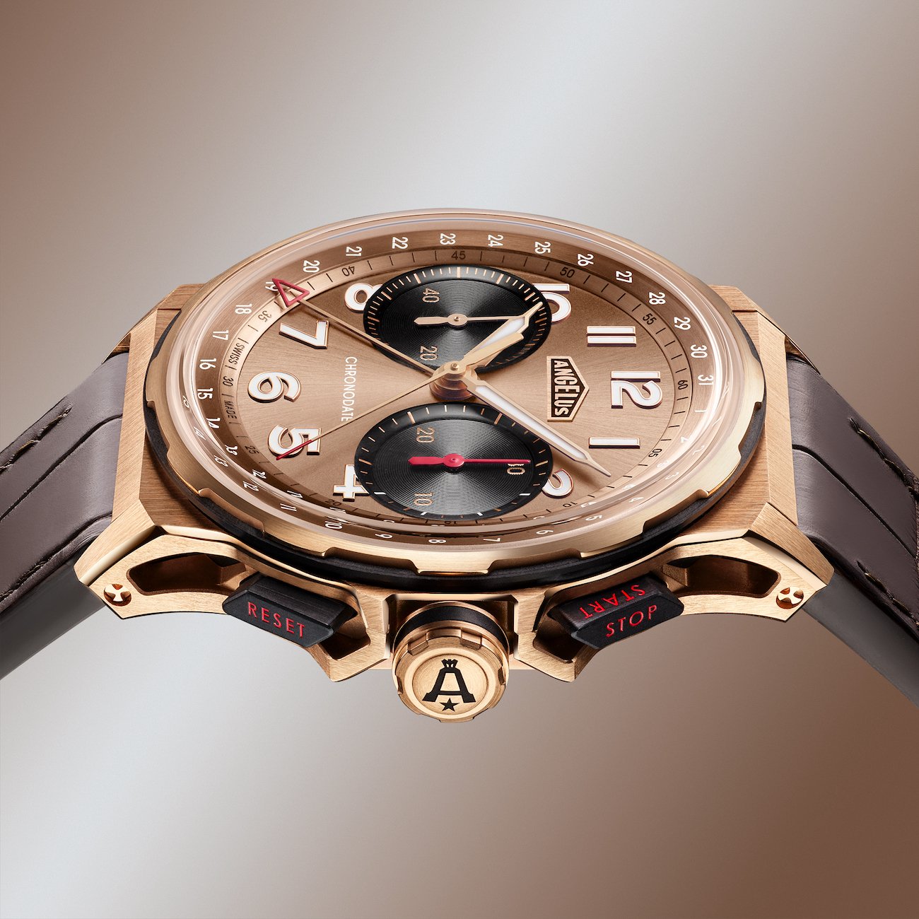 That mocha-brown dial is where things get truly delicious. Applied with a fine sunray-brushed finish, the amber-tinged surface creates depth and dimension, while oversized Arabic numerals in gold—filled with SuperLumiNova—recall the remarkably legible 1930s Angelus chronographs that made the brand's reputation. The 30-minute totalizer at 3 o'clock and small seconds at 9 o'clock stand apart in metallic black with snailed textures, providing visual hierarchy without cluttering the composition. Red lacquer accents on the chronograph hands and pusher markings add just enough pop to keep things lively.
