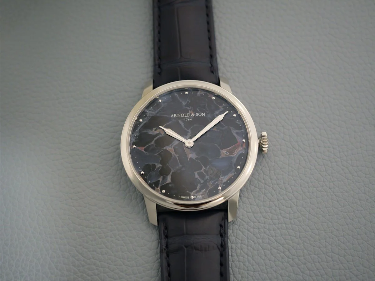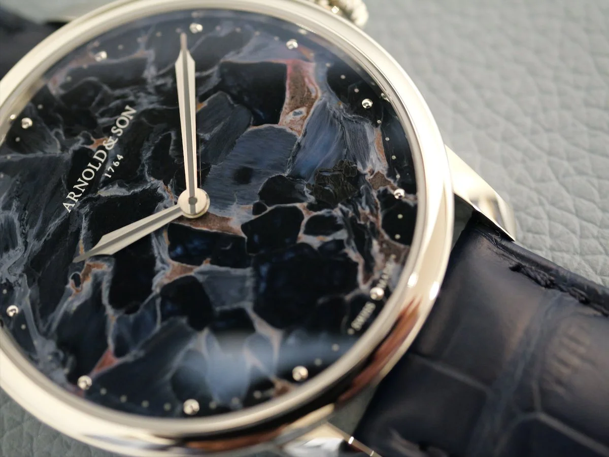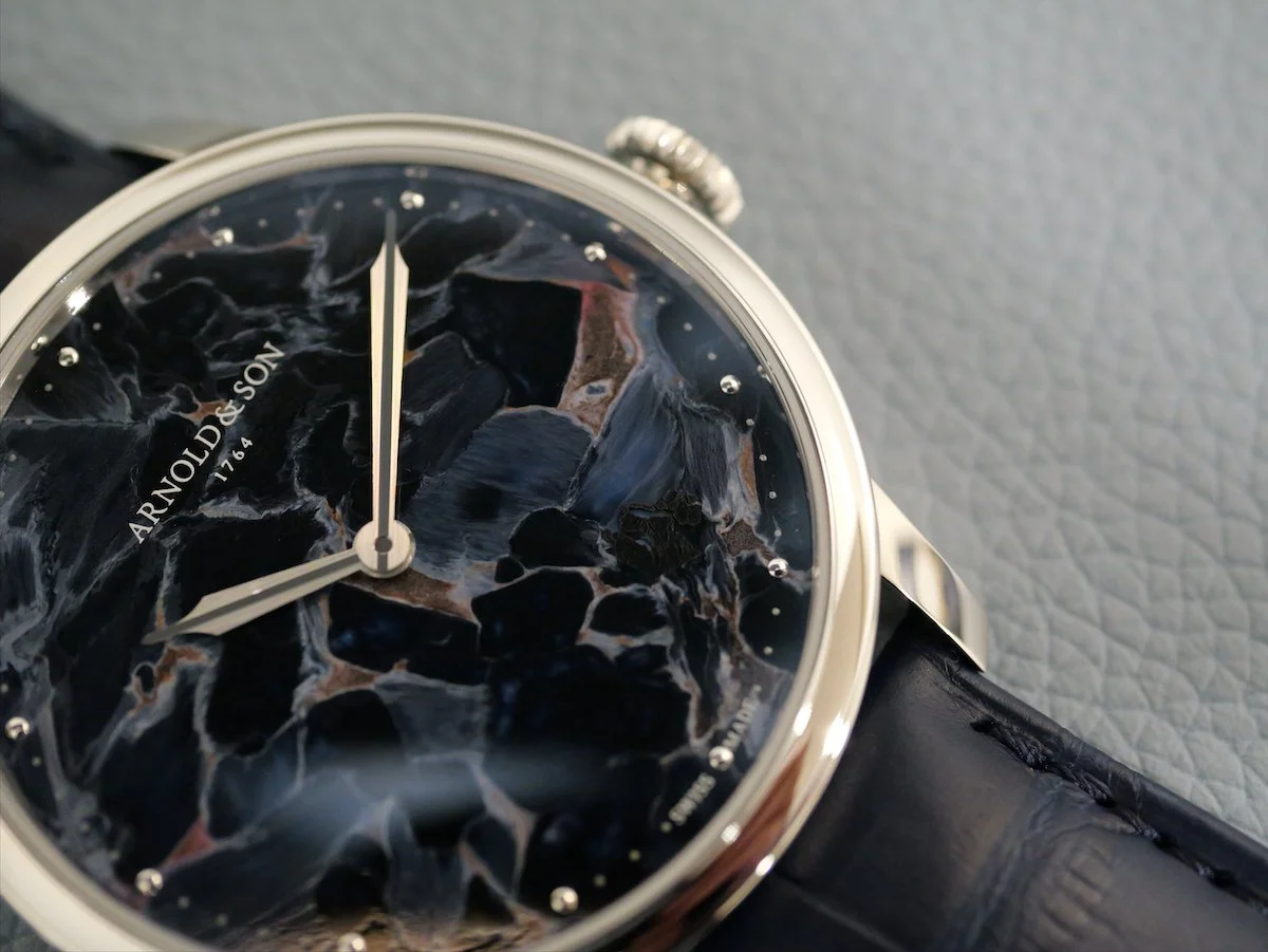 Pietersite is a variety of chalcedony first discovered in Namibia in the early 1960s by Sid Pieters—hence the name. Arnold & Son selected it for the natural movement in its patterns, which evoke the turbulent coastal skies of Cornwall and the seas that Arnold's marine chronometers once helped navigate. No two stones are identical, which means each of the 18 steel pieces in the limited run is, by definition, unrepeatable.