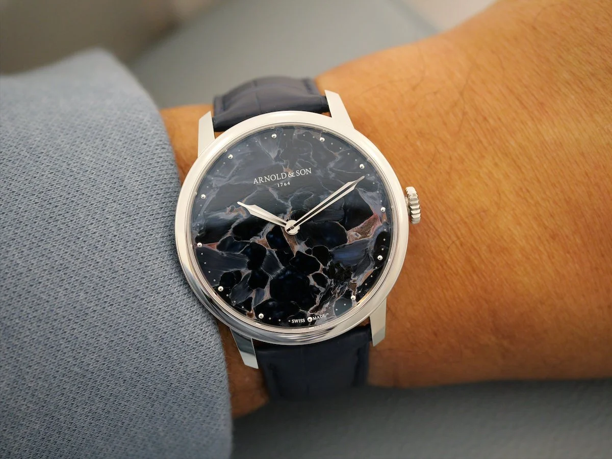 There are dials that display the time, and then there are dials that demand you stop to look. The Arnold & Son HM Pietersite, which we handled at Watches and Wonders Geneva 2026, belongs firmly to the latter category. The brand has set a slice of Namibian pietersite—the so-called "stone of storms"—into an ultra-thin dress watch that references John Arnold's Cornish heritage through its swirling, storm-sky patterns. In person, the effect is more arresting than press imagery suggests. The watch is offered as a limited edition in both steel—18 pieces—and 18K red gold—8 pieces.
