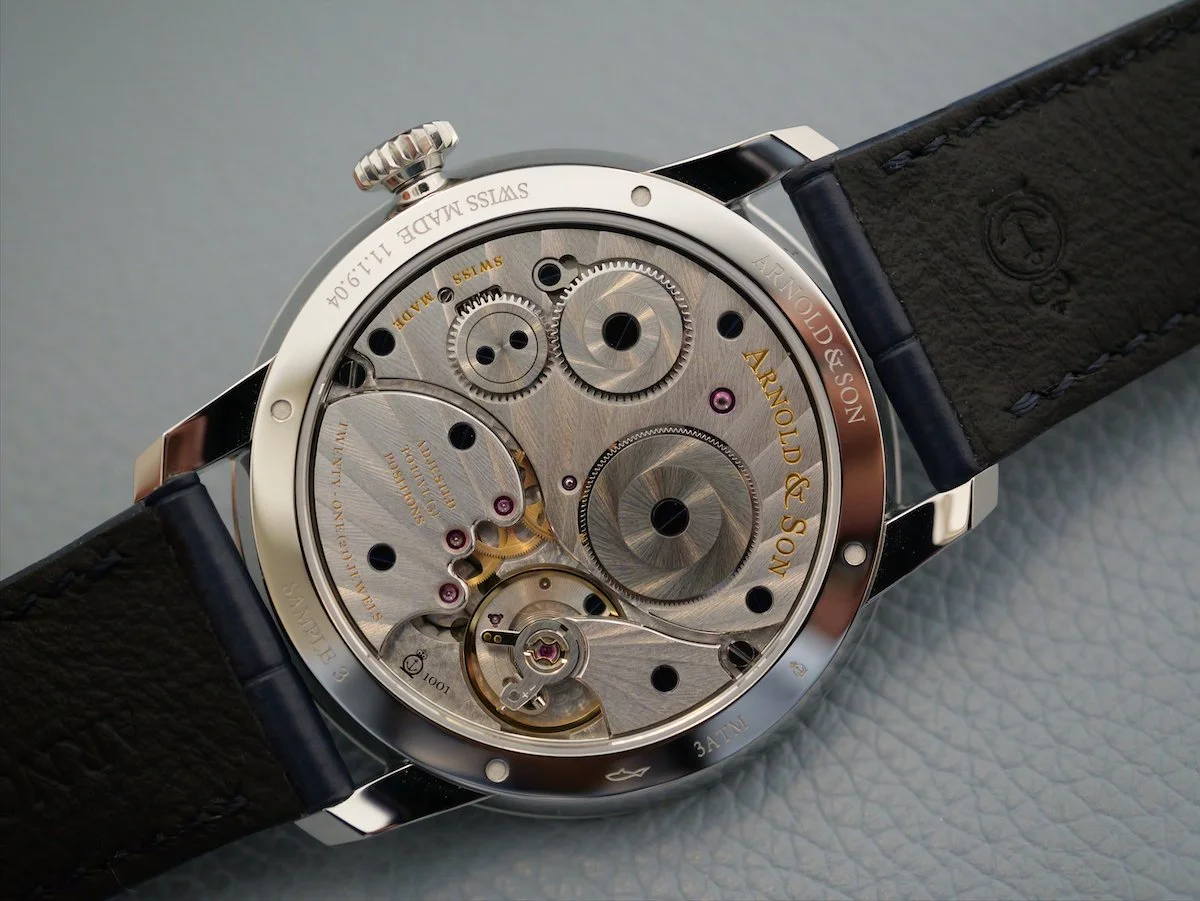 The Arnold & Son HM Pietersite runs on the caliber A&S1001, a manual-wound in-house movement that, at that thinness, leaves every finishing decision visible and consequential. The main plate is rhodium-plated with a circular-grained surface; the bridges carry chamfered edges and a radiating Côtes de Genève decoration; the wheels are snail-finished; the screws are blued with polished, chamfered heads. The movement beats at 21,600 vph, and the fully wound barrel delivers a 90-hour power reserve. It is visible through a sapphire case back with anti-reflective treatment.