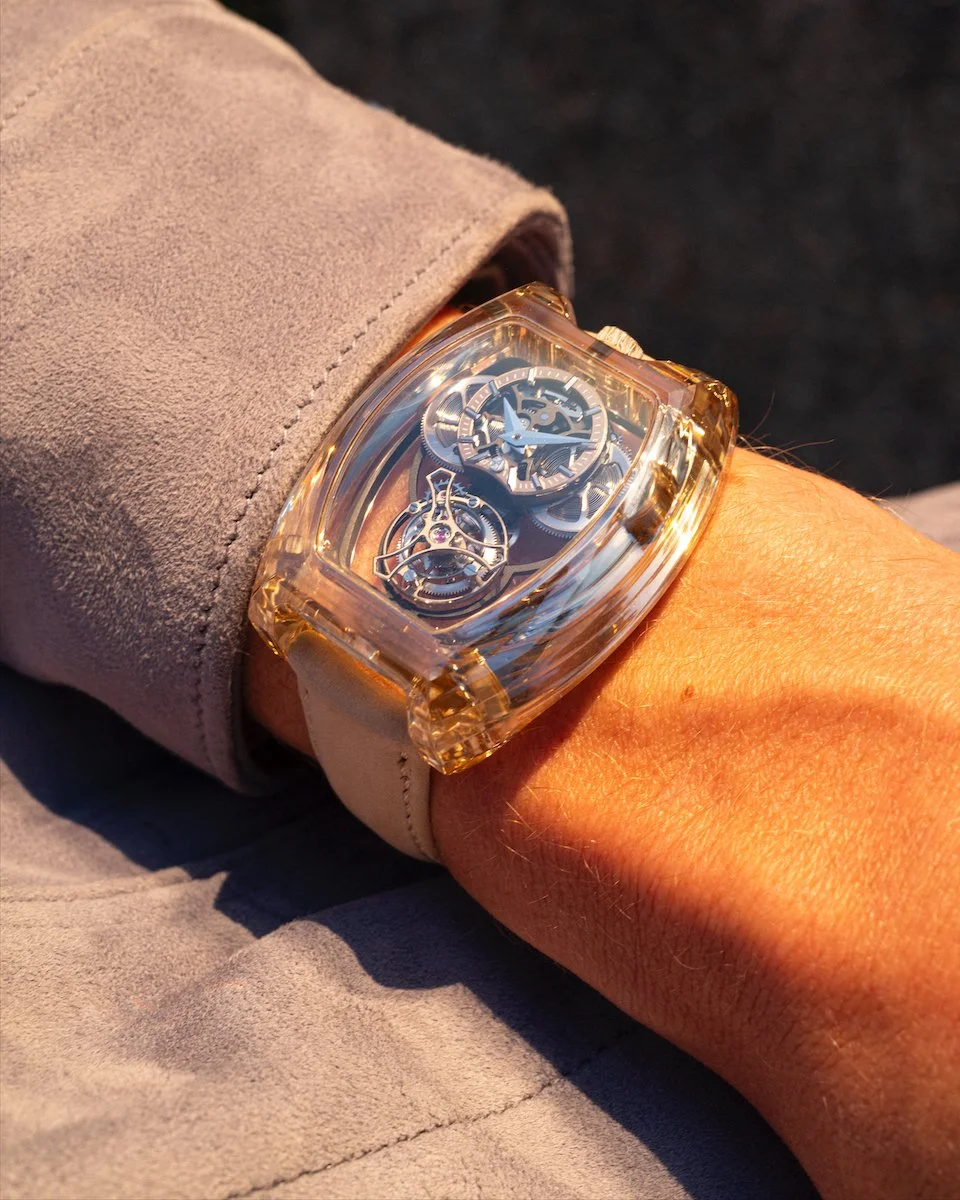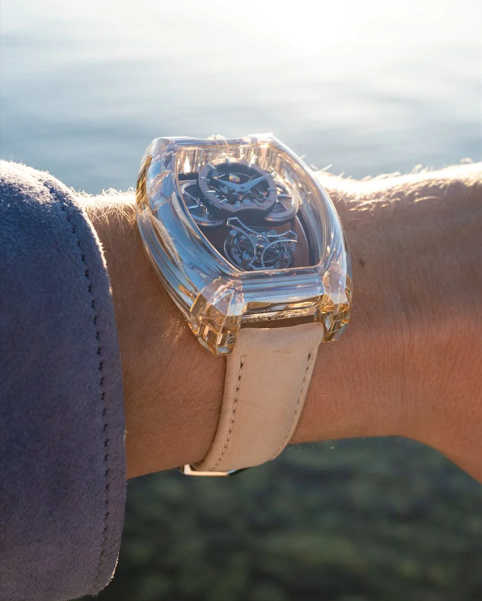Moissanite is not new to ArtyA, it was introduced as the world's first moissanite-cased watch at Only Watch in 2023, though that was a round case. The leap to a curved tonneau architecture is significant: moissanite sits between 9.25 and 9.5 on the Mohs scale—harder than sapphire, second only to diamond—and its melting point exceeds 2,700°C. Machining it into complex curved surfaces requires proprietary processes developed in-house by Stanislas Arpa, the founder's son, who leads both ArtyA's creative direction and its materials R&D. No other watchmaker currently works with this material.