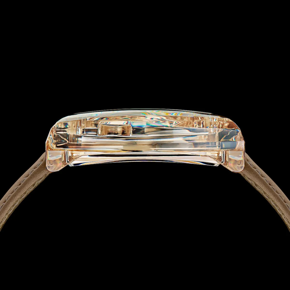 ArtyA enhances this with 65 hand-cut facets across the tonneau surfaces, and the crystal’s natural champagne hue adds warmth to the visual presentation. The curved flanks also act as a magnifying lens over the movement, creating an optical depth effect that is central to the design intent.