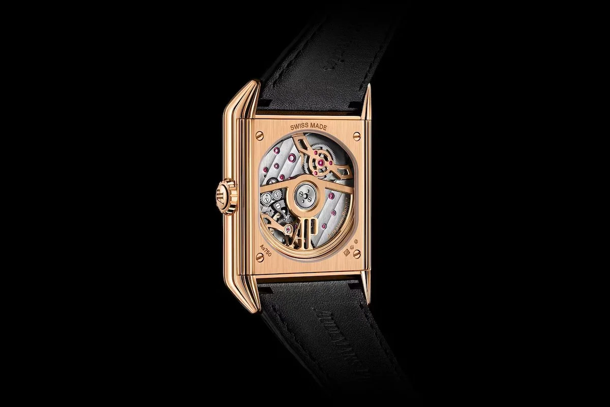 The rectangular case measures 34mm in width and length with an 8.8mm profile, its proportions elongated by extended lugs that emerge from vertical gadroons flanking each side—eight per surface—whose ridged texture evokes Streamline Moderne's aerodynamic vocabulary. This late Art Deco movement, also known as style paquebot for its association with ocean liners, emphasized fluid geometry and propulsive lines. Le Brassus explored these principles briefly before the 1929 market crash curtailed demand for such refined complications, with the platinum example from that original series now residing in the Musée Atelier Audemars Piguet.
