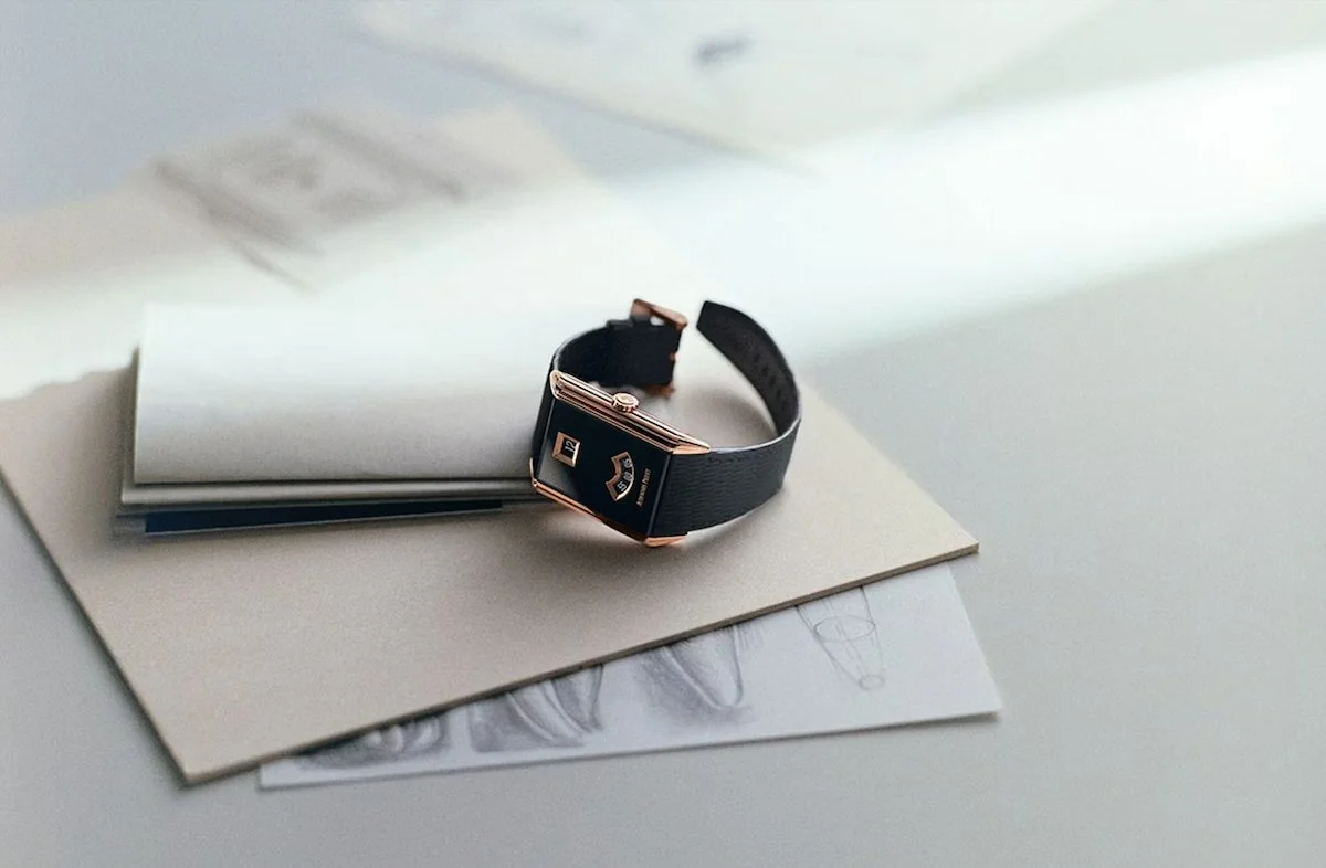 The black textured calfskin strap with an 18K pink gold folding clasp completes a package that balances 1920s formal vocabulary with execution standards possible only through current technical capabilities.