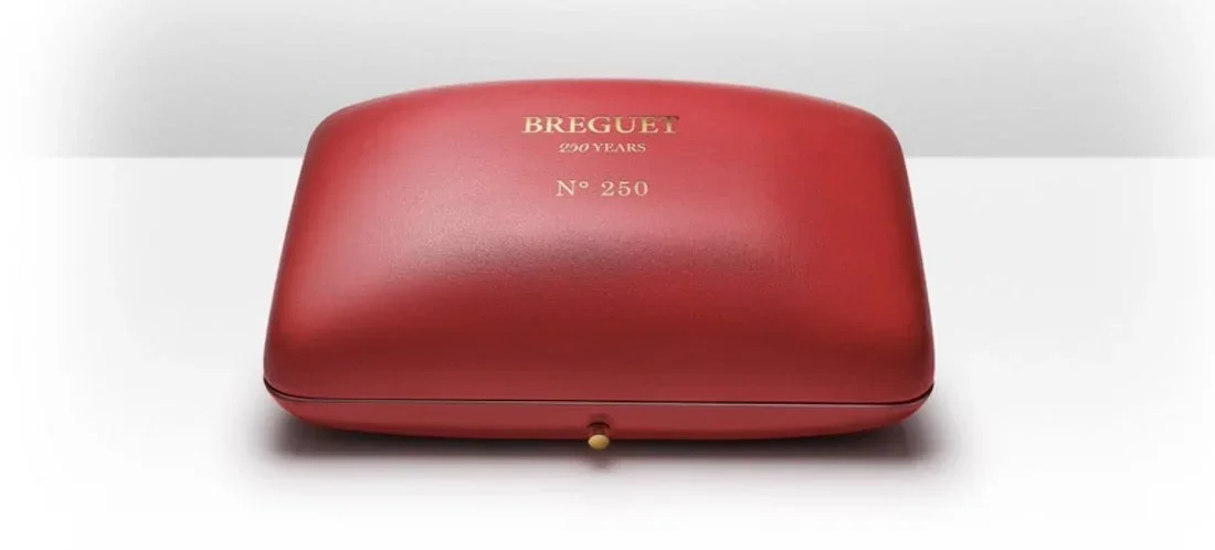 The watch is presented on a navy blue, large-scaled, alligator leather strap with an 18K Breguet gold pin buckle, housed in an individually numbered red leather 250th anniversary special edition box inspired by the historical red Moroccan leather Breguet presentation boxes. Each piece is backed by a five-year international warranty and the guarantee of lifetime repairability—a commitment befitting a manufacture that values its heritage as much as its innovation.