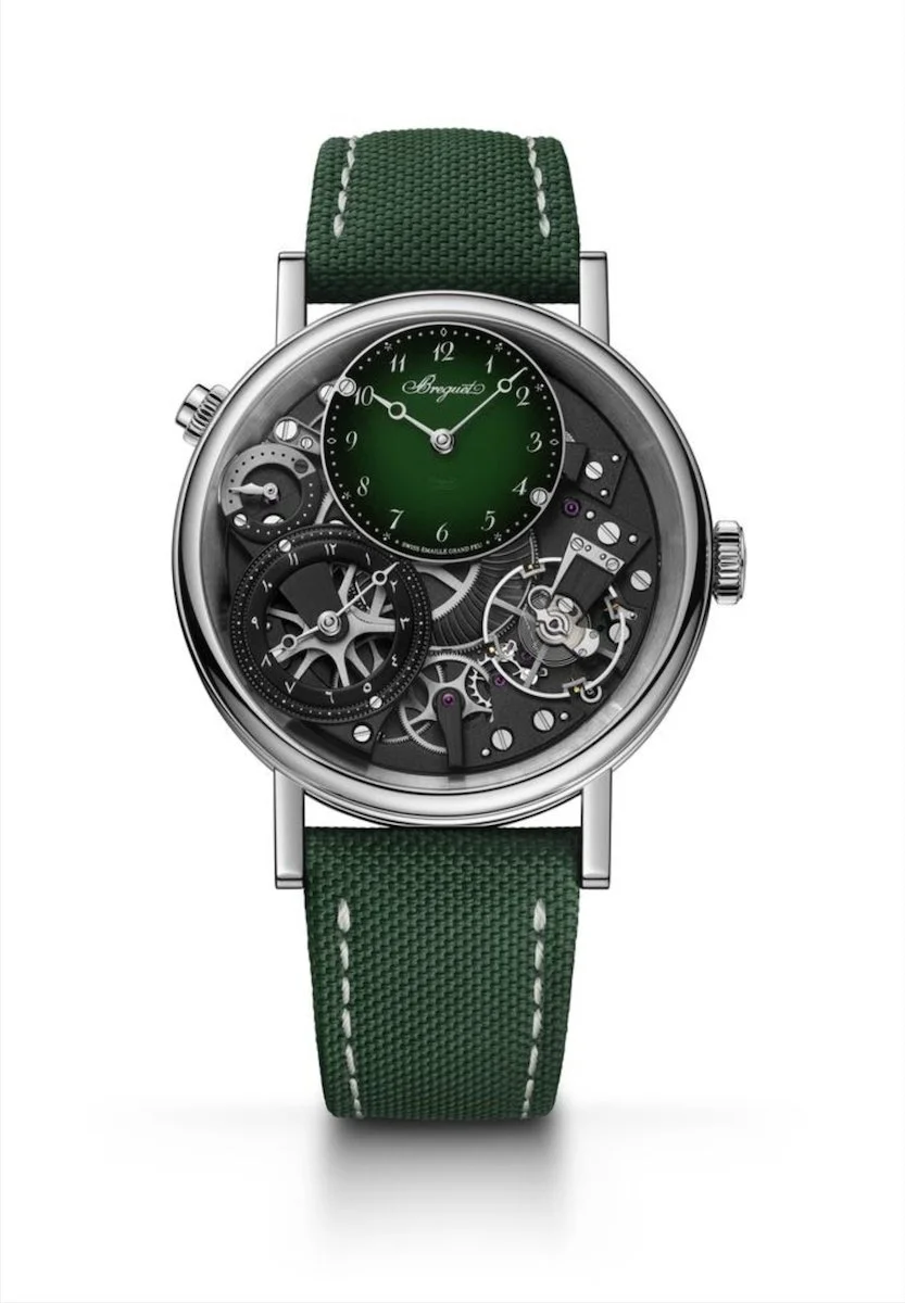 The Breguet Tradition GMT 7067 makes its own case for the collection's artistic range. Its 40 mm platinum case houses a green-gradient Grand Feu enamel dial—a technical achievement requiring master enamellers to execute a seamless fade from pine green at the center to absolute black at the rim. The dual-time display places local time on the main dial and home time on a subdial at 8 o'clock, with an Arabic or Oriental numeral option for the latter—the Oriental variant reviving a bespoke customization Abraham-Louis Breguet offered Ottoman clients in the early 1800s.