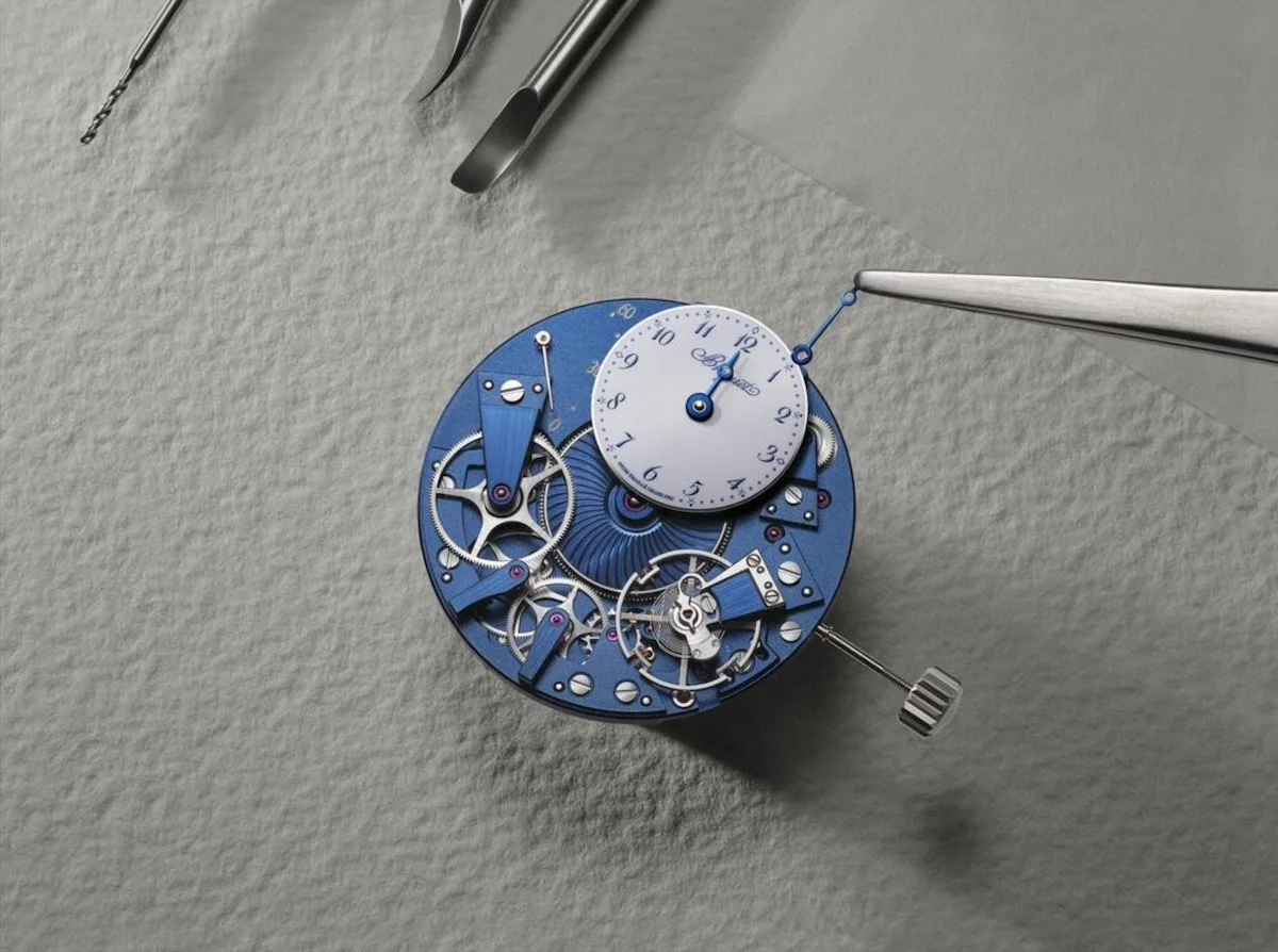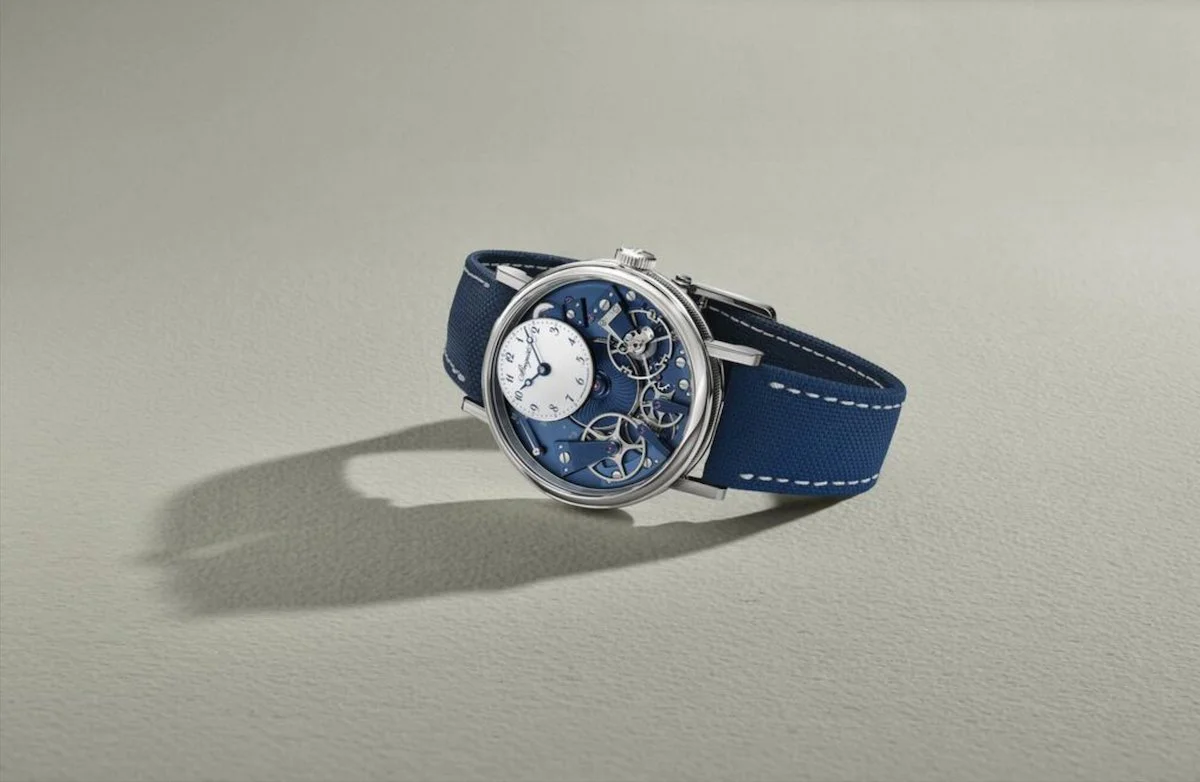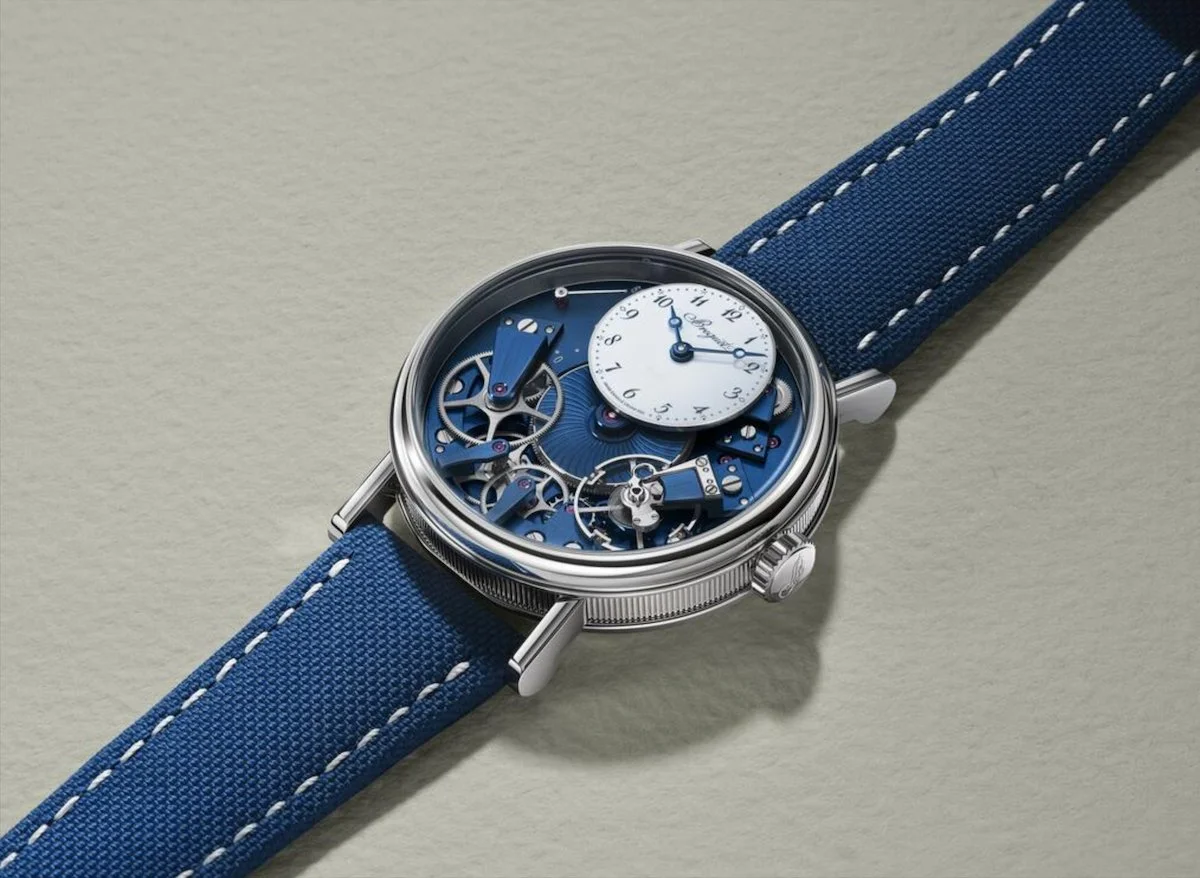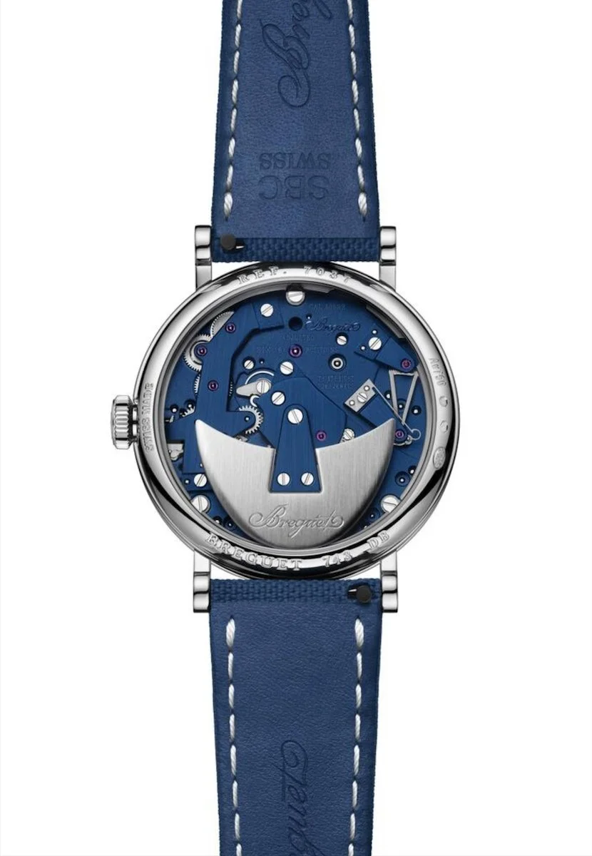 The lead model, the Breguet Tradition Seconde Rétrograde 7037, makes the boldest statement: an entirely blue movement, achieved through ALD treatment on both bridges and mainplate, paired with a white Grand Feu enamel dial carrying Breguet Arabic numerals—the same numeral style Abraham-Louis Breguet himself adopted in 1799. The 38 mm white gold case is stripped of complications beyond hours, minutes, and a retrograde seconds hand at 10 o'clock, letting the all-blue calibre do the talking. A platinum-black variant adds a starker alternative.