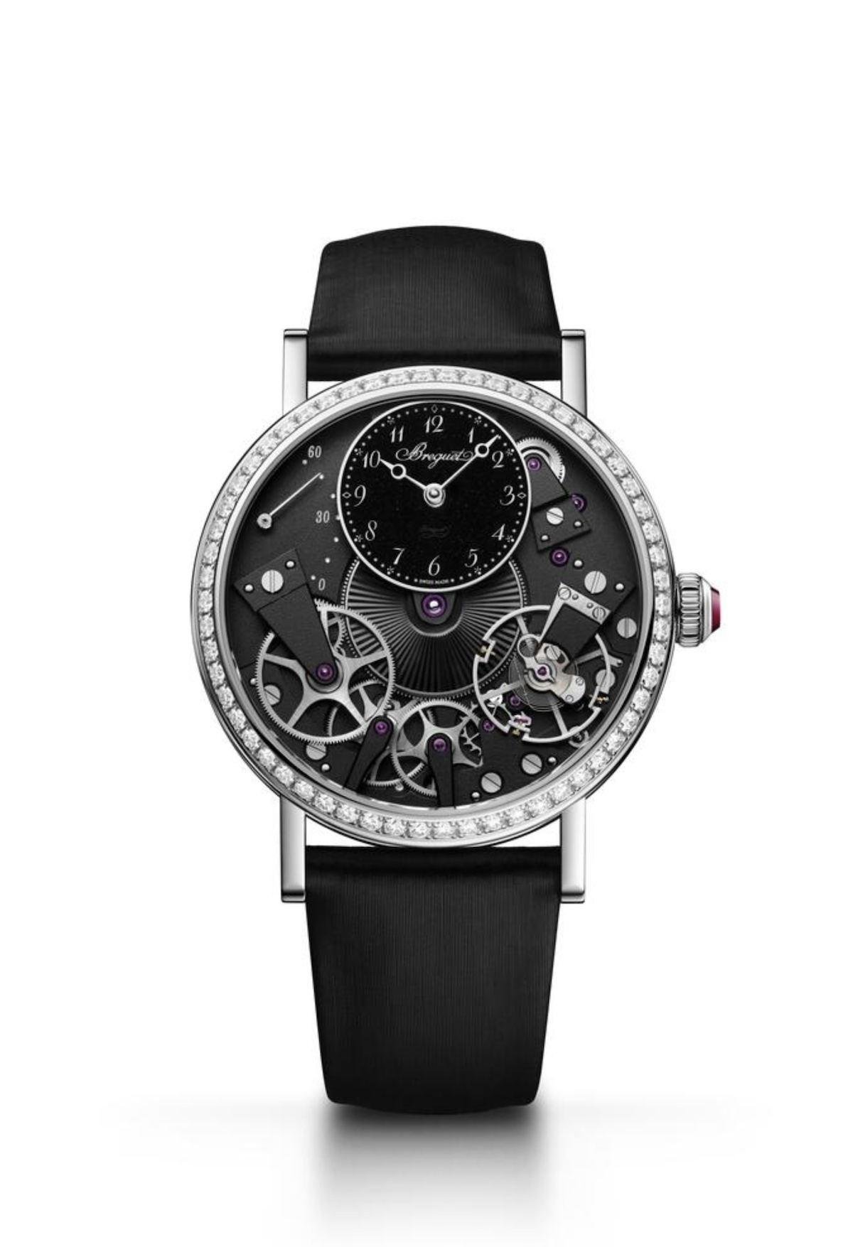 The Breguet Tradition Seconde Rétrograde 7038, at 37 mm in rhodium-plated white gold, is the jewelry piece of the group—a diamond-set bezel enclosing 58 brilliant-cut stones, a black aventurine glass dial with silver-toned powdered transfers, and sunburst guilloché finishing both the barrel cover and the half-crown oscillating weight.