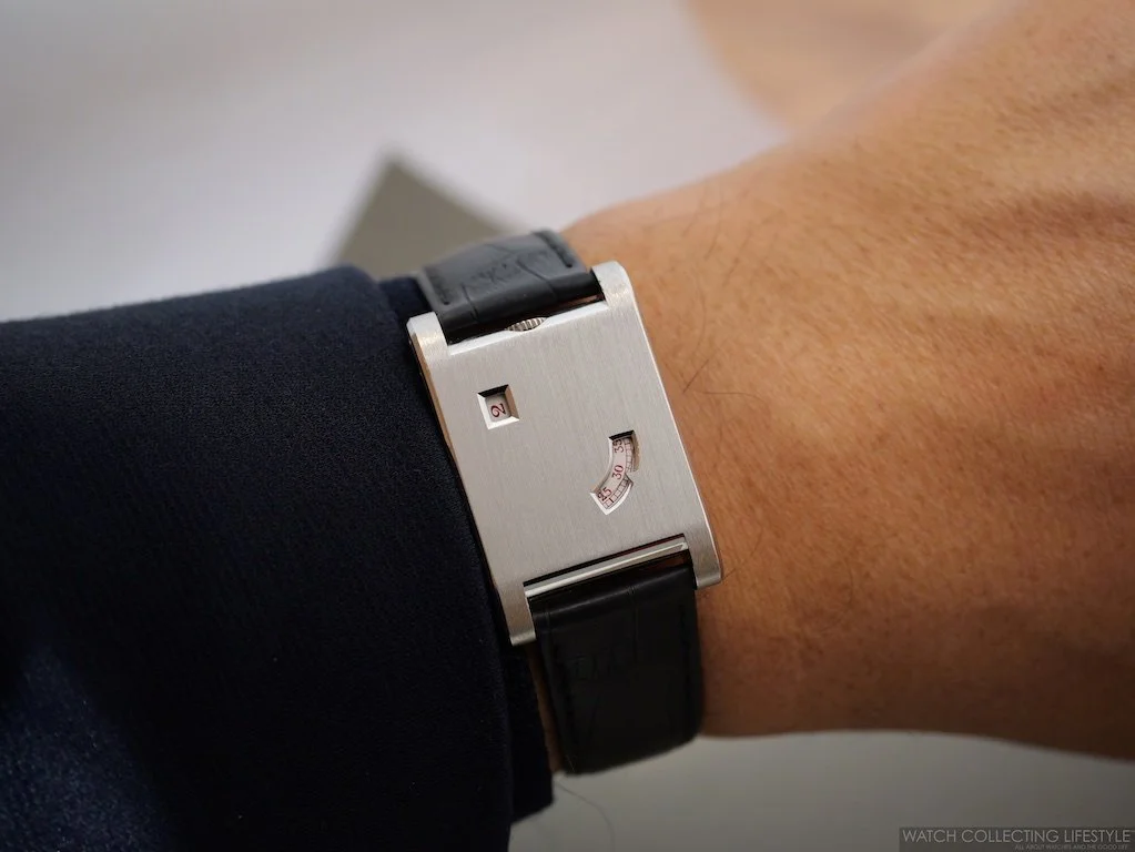 On this contemporary limited edition, the two windows are positioned obliquely—at an angle—rather than parallel to the case edges. This diagonal arrangement creates a dynamic visual tension across the otherwise minimalist platinum face. The jumping hours’ aperture is positioned toward the upper left quadrant of the case, while the dragging minutes’ window appears in the lower right, connected visually by an imaginary diagonal line across the face.