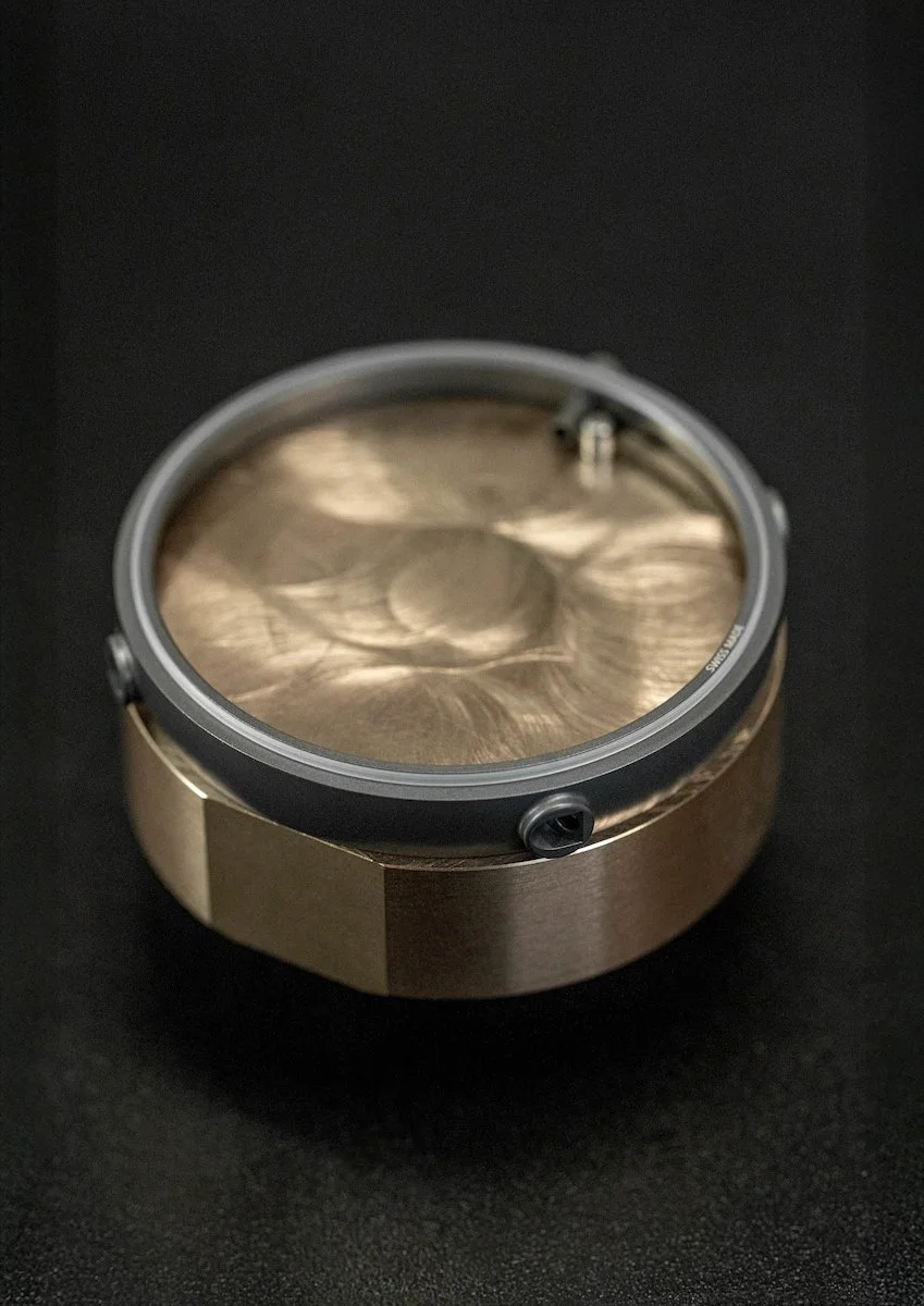 The case, movement bridges, and mainplate are crafted entirely in ceramicised titanium—an aerospace-grade material treated through electroplasma oxidation technology. This process yields a Vickers hardness of 1,000, with scratch and shock resistance comparable to that of ceramic, while maintaining titanium's characteristic lightness.