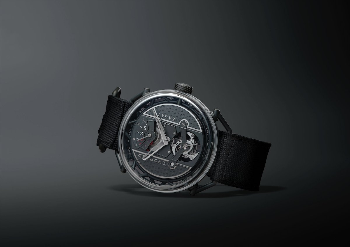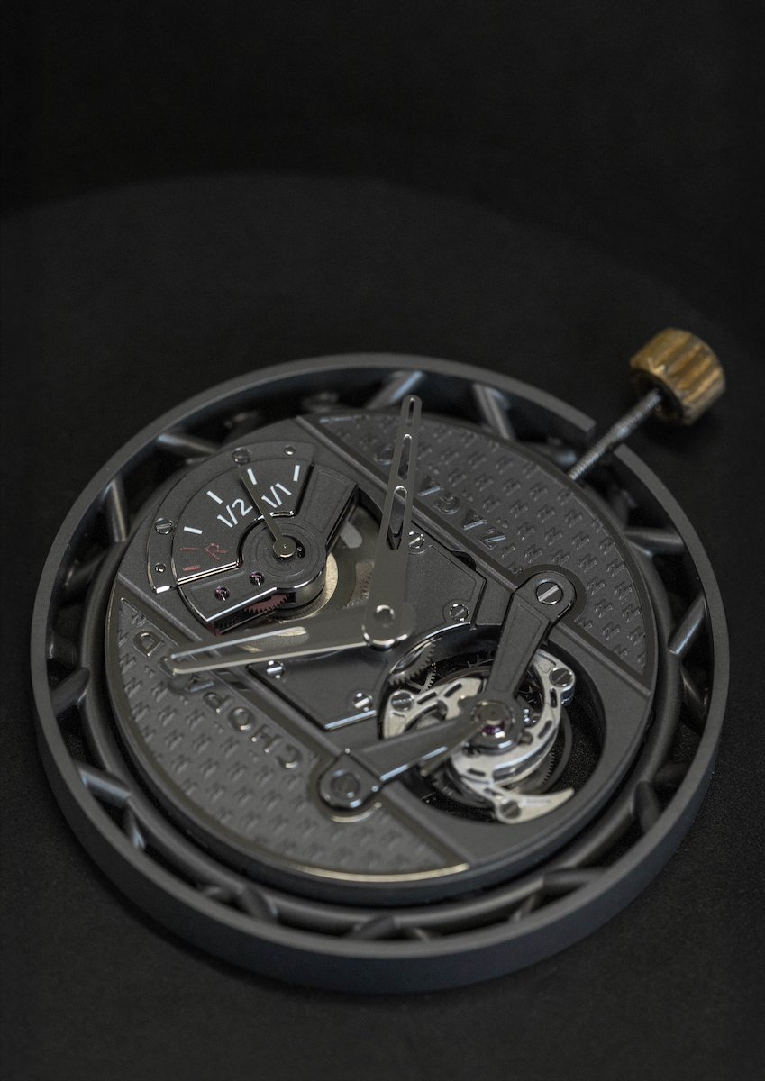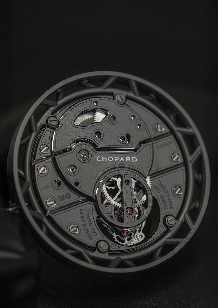 The case design follows the philosophy borrowed directly from competition car chassis design, and the ceramicised titanium 42 mm case uses a tubular architecture in which the L.U.C 04.04-L movement sits supported by a framework of tubes rather than traditional lugs.