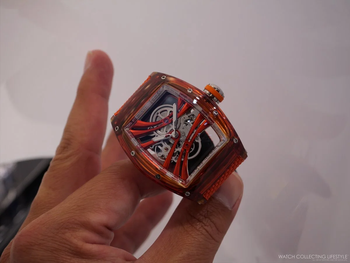 CVSTOS has long understood that a watch case is not merely a container—it is a statement. With the Challenge Purity Sapphire collection, the Geneva-based manufacture makes that statement in the most literal and luminous way possible: the tonneau-shaped Challenge II case is machined entirely from sapphire crystal. Four colorful expressions and one clear sapphire case with orange bridges. Yellow, orange, and blue, with matching bridges to match the color of the sapphire case, and a red sapphire case with black bridges—each limited to just ten pieces—turn the wrist into something closer to a vitrine than a timepiece.