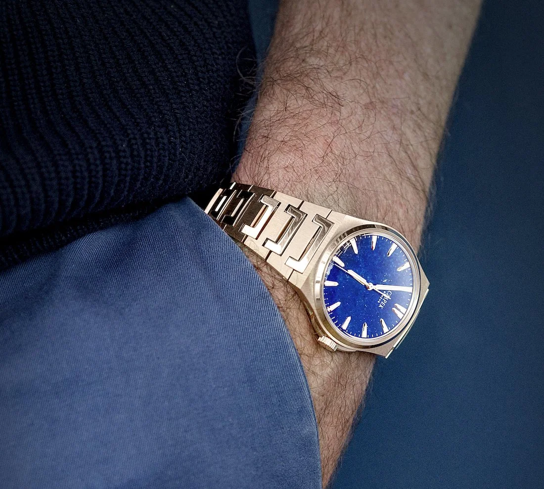 The collection comprises three distinct personalities, each featuring rare stone dials that make every piece genuinely unique. The Lapis Lazuli variant showcases the deep celestial blue that has captivated civilizations for millennia, its golden specks catching light like stars against a midnight sky.