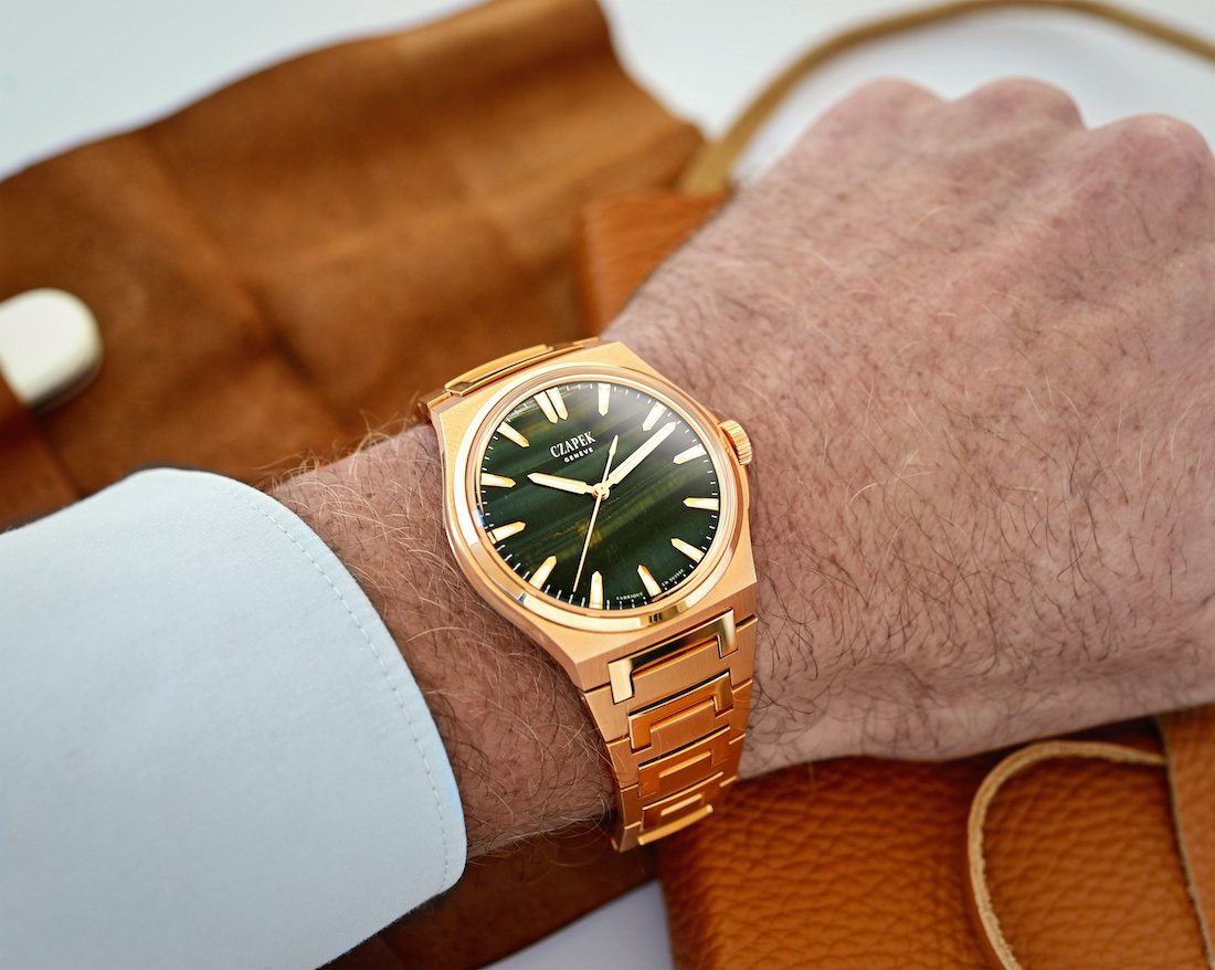 Sticker Price CHF66,000—USD 83,000—Lapis Lazuli on bracelet, CHF43,000—USD 54,000—on rubber strap, and CHF39,000—USD 49,000—on alligator strap; Sticker Price CHF62,000—USD 78,000—Falcon Eye on bracelet, CHF39,000—USD 49,000—on rubber strap, and CHF35,000—USD 44,000—on alligator strap. More info on Czapek here.