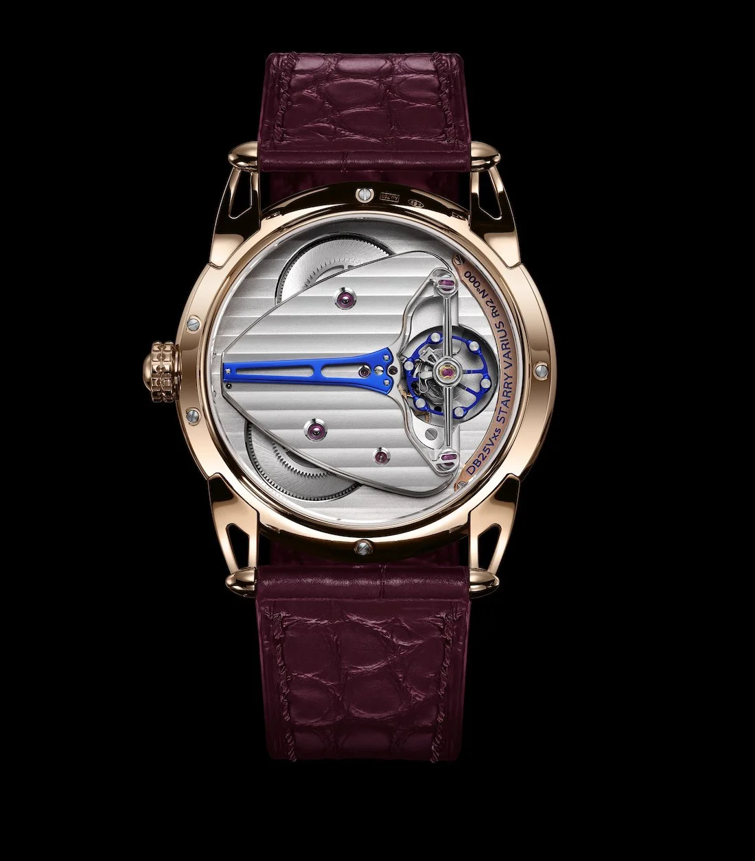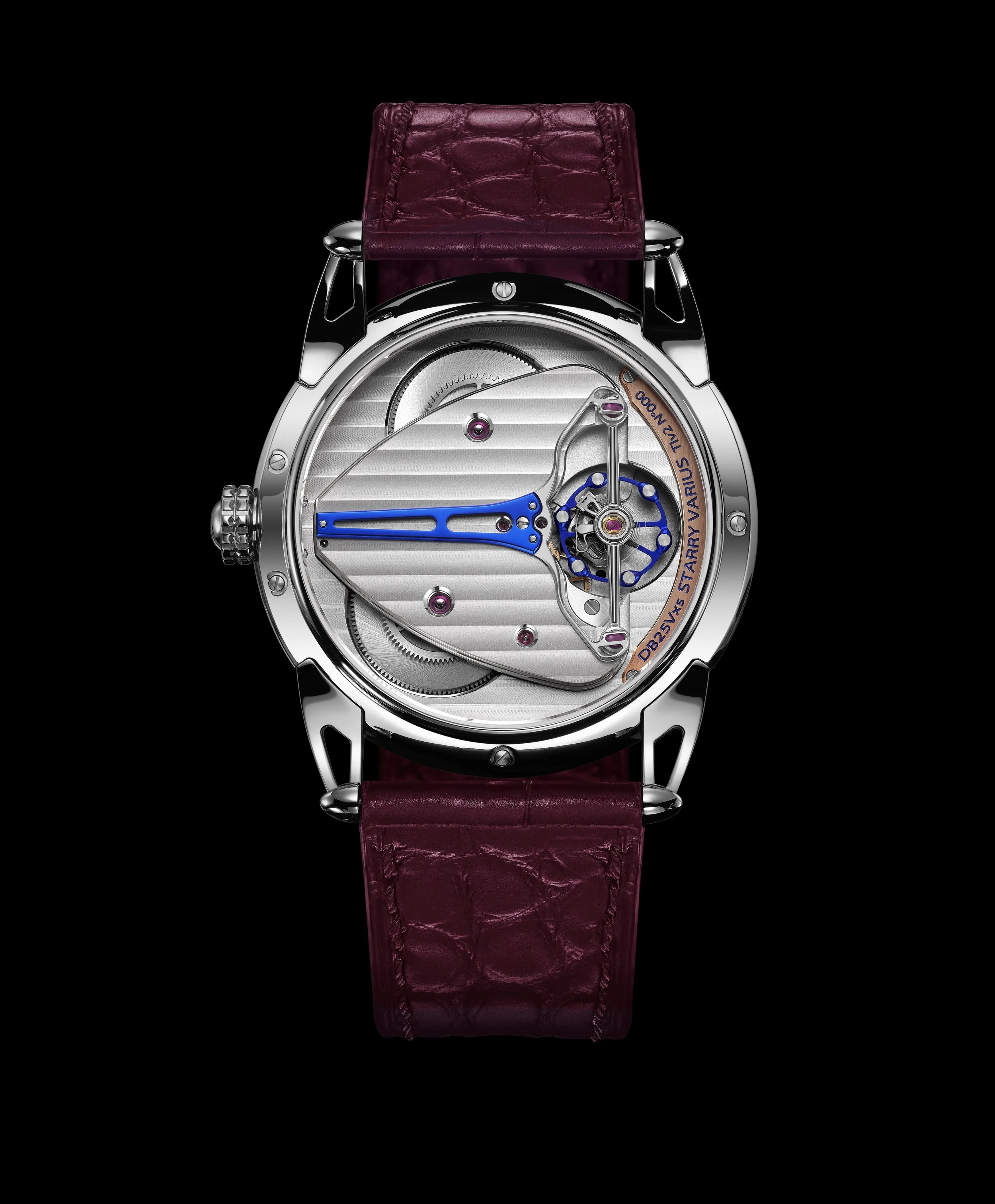 The DB25Vxs Starry Varius is offered in two distinct interpretations: the mirror-polished grade 5 titanium case and the warmer 5N rose gold version. Both feature the same burgundy alligator leather strap, creating a cohesive color story that extends from dial to wrist. The 5N rose gold variant, with its polished 5N rose gold case and matching hands gliding over the silver-toned time ring, offers a particularly warm and luxurious feel. This version is supplied with an additional red nylon fabric strap. Meanwhile, the grade 5 Titanium model appears colder and more masculine. An additional grey nylon fabric strap accompanies this model.