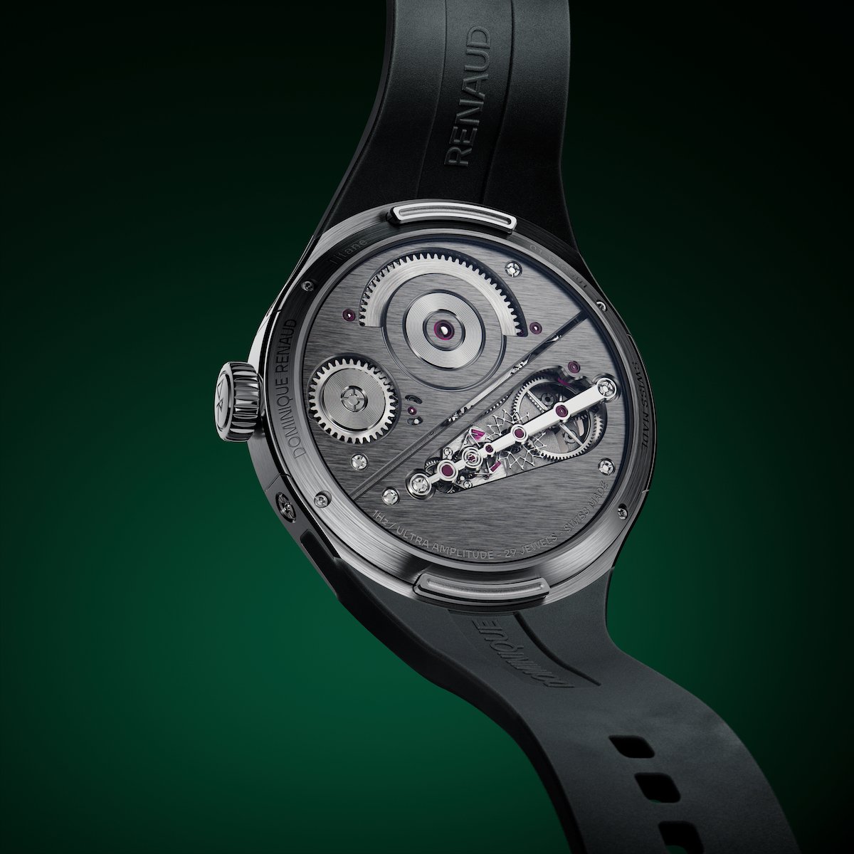The integrated rubber strap uses an invisible push-button interchangeable system, and the watch ships with both a pin buckle and a triple-folding clasp. The flat sapphire case back—also anti-reflective—reveals the crown wheel, ratchet, and an openworked escapement line, making the offset double-roller system visible.