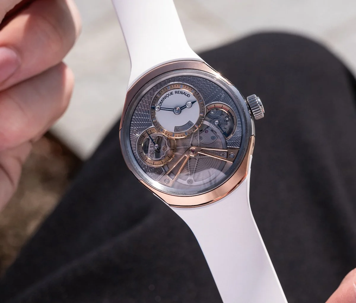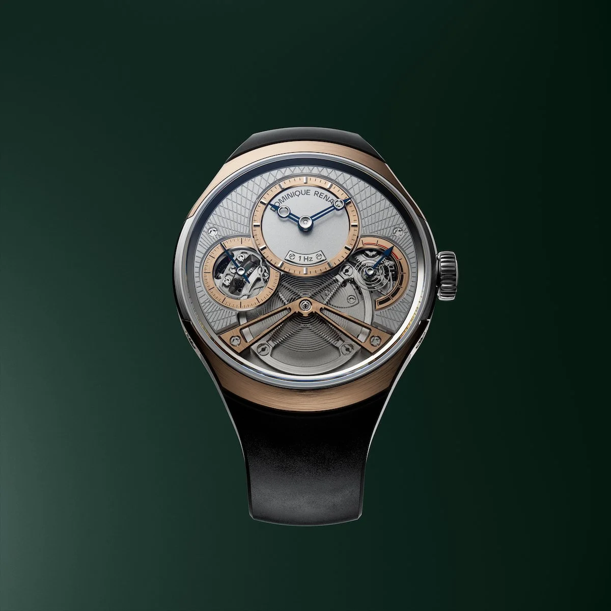 At 40 mm x 44 mm x 12 mm in Grade 5 titanium, it wears larger than a typical 40 mm round watch but avoids the bulk often associated with unconventional case architectures. Water resistance is 30 meters and there are three versions. The titanium version comes with grey or black dials, an opaline base, and diamond-cut openings. The bi-material pink gold and Grade 5 titanium variant features a guilloché dial—traditional technique, modern execution. Both versions carry a circular satin-brushed top that deliberately nods to the 1970s, a period Renaud has cited as formative for his design sensibility.