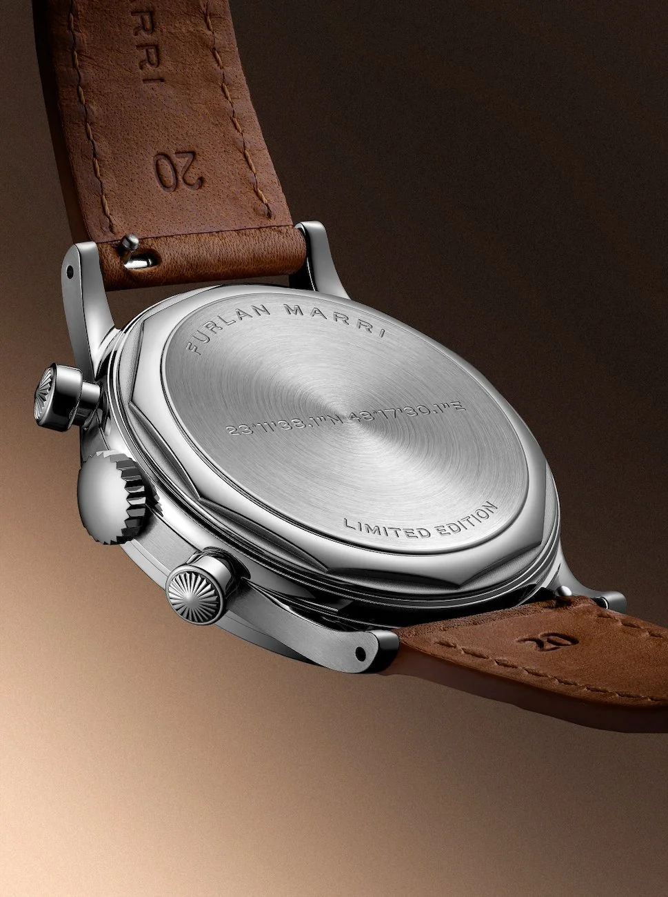 The case back bears coordinates marking a specific location chosen for its striking beauty, with the dial directly reflecting this landscape's dunes and tones as seen from above. Powering this watch is the Seiko VK64 mechaquartz movement, which combines quartz reliability with mechanical chronograph performance, delivering ±20 seconds monthly accuracy while providing instantaneous hand reset and tactile pusher engagement. Furlan Marri's embrace of mechaquartz isn't cost-cutting but a deliberate philosophy, allowing a focus on case construction and finishing details.
