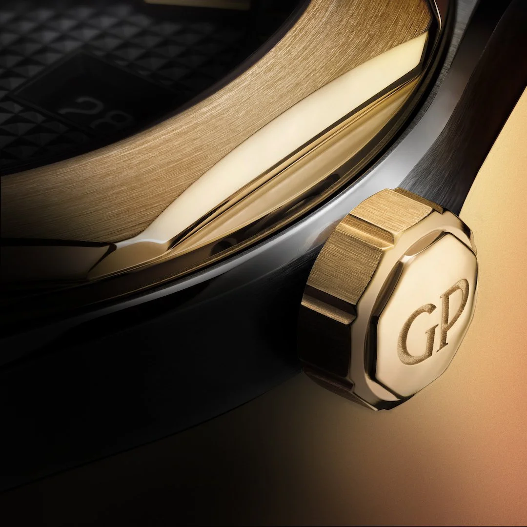 The integrated bracelet exemplifies the marriage of aesthetics and ergonomics. Its tapered design features steel 'H' links that progressively narrow toward the clasp, with slightly shorter links on this new model allowing the bracelet to follow the wrist's natural curve more closely. Central links in yellow gold are subtly more domed than their steel counterparts, creating dimensional depth. The triple-folding clasp, engraved with the GP logo and featuring octagonal push-pieces that echo the bezel, incorporates an innovative fine adjustment system, enabling precise 4 mm micro-adjustments—particularly welcome during warmer weather.