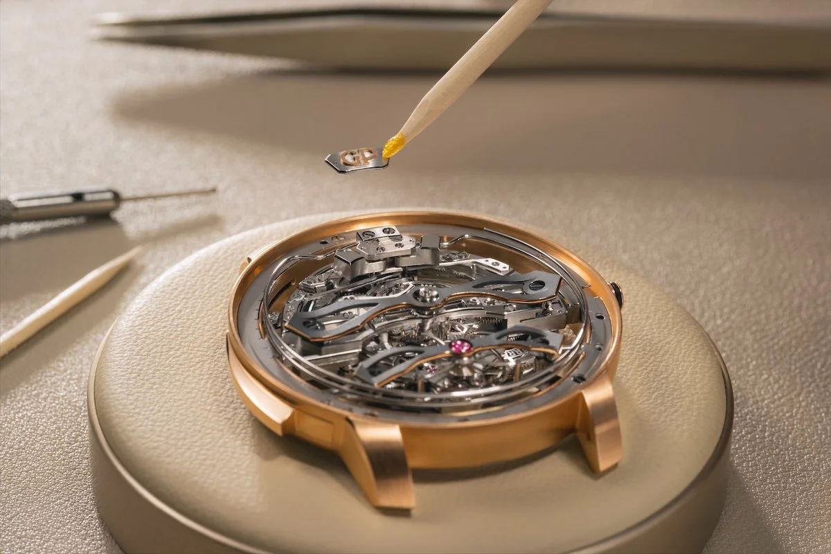 The openworked architecture isn't purely decorative; removing material from the movement allows sound to reverberate more freely within the case. GP's lyre-shaped tourbillon cage, a design the brand has used since the 19th century, doubles as a small seconds display. Assembly and decoration require over 440 hours, and each finished calibre carries a small plate engraved with the initials of the master watchmaker who built it. The movement features 1,340 hand-polished chamfers, 295 of which are interior angles.