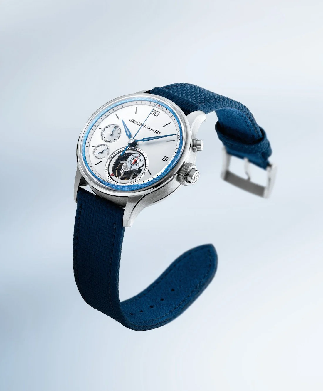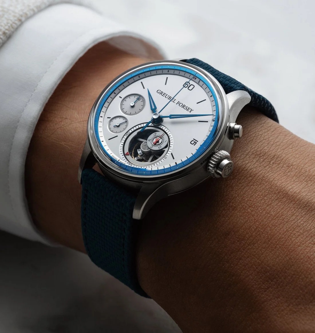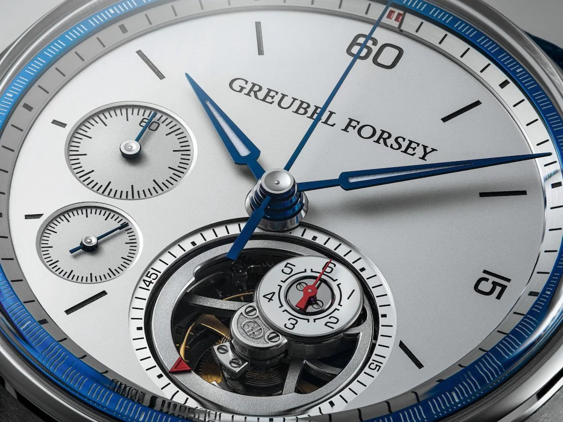 The visual drama centers on Greubel Forsey's first flying tourbillon, with the nano foudroyante mechanism embedded within its rotating architecture. Brilliantly, the foudroyante dial maintains constant vertical orientation even as the tourbillon spins, ensuring optimal readability—a detail that speaks to the thoughtful engineering permeating every aspect of this timepiece.