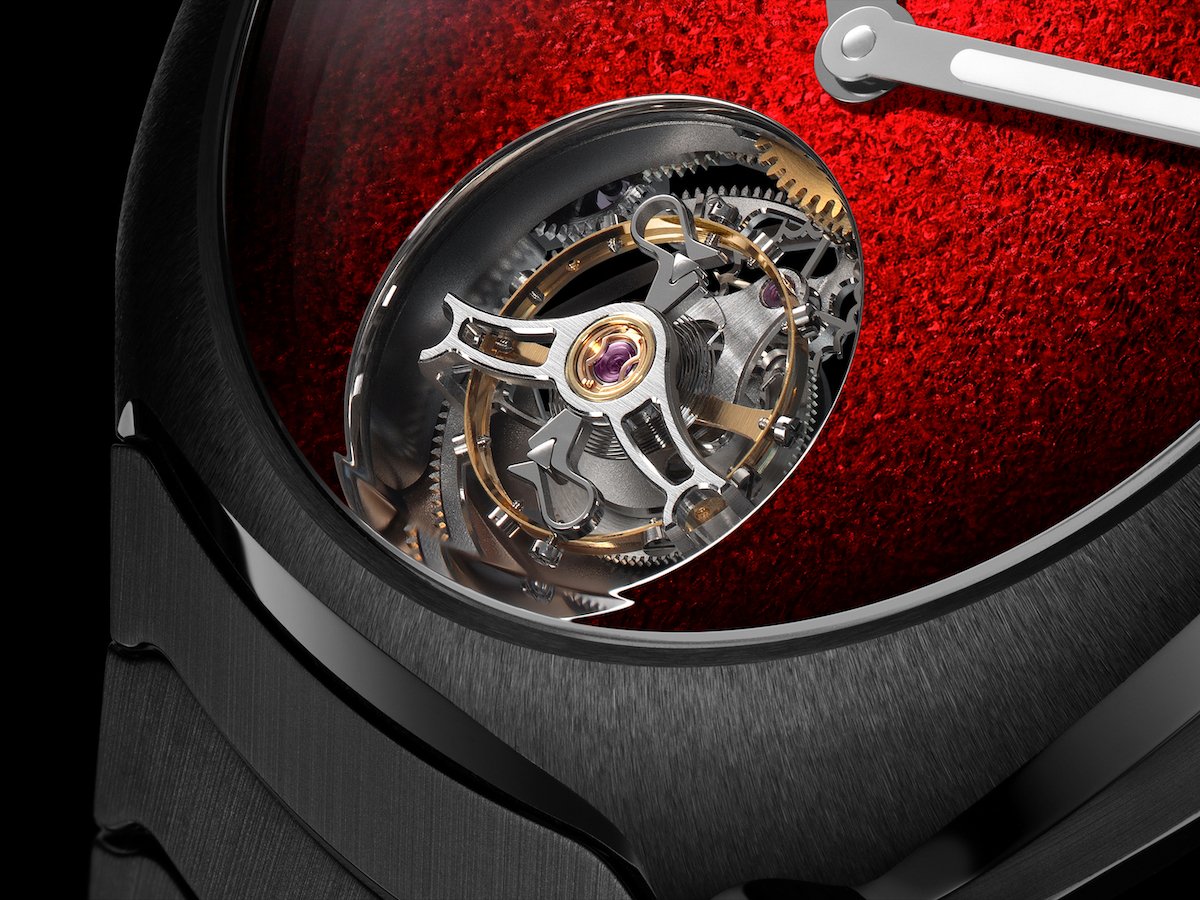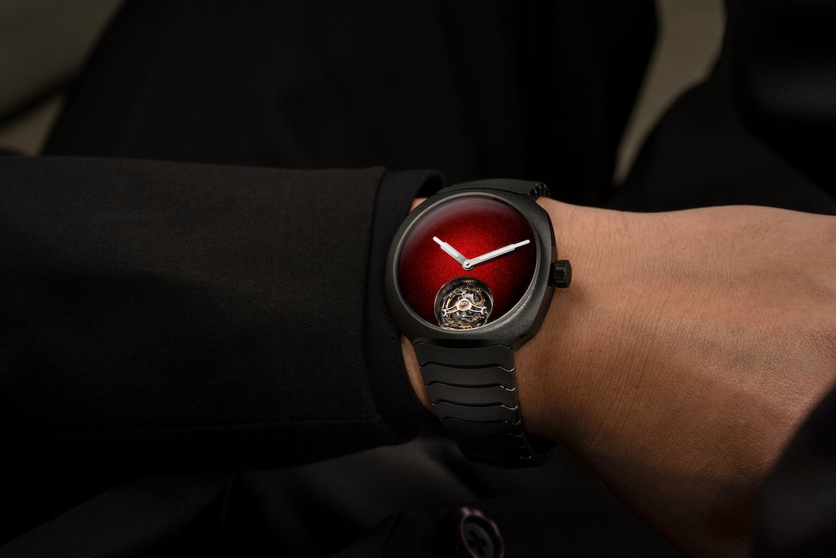 At the center of that restrained grey shell sits a Red fumé Grand Feu enamel dial that borders on confrontational. Two enamel pigments are hand-applied in a gradient over a hammered white gold base, then fired repeatedly to achieve a chromatic depth that shifts between deep crimson and luminous scarlet. True to Moser's Concept philosophy, there are no indices, no logo, just colour, light, and a pair of hands fitted with Globolight inserts. The visual contrast against the anthracite ceramic is arrestingly good. At six o’clock, the one-minute flying tourbillon takes the center stage.