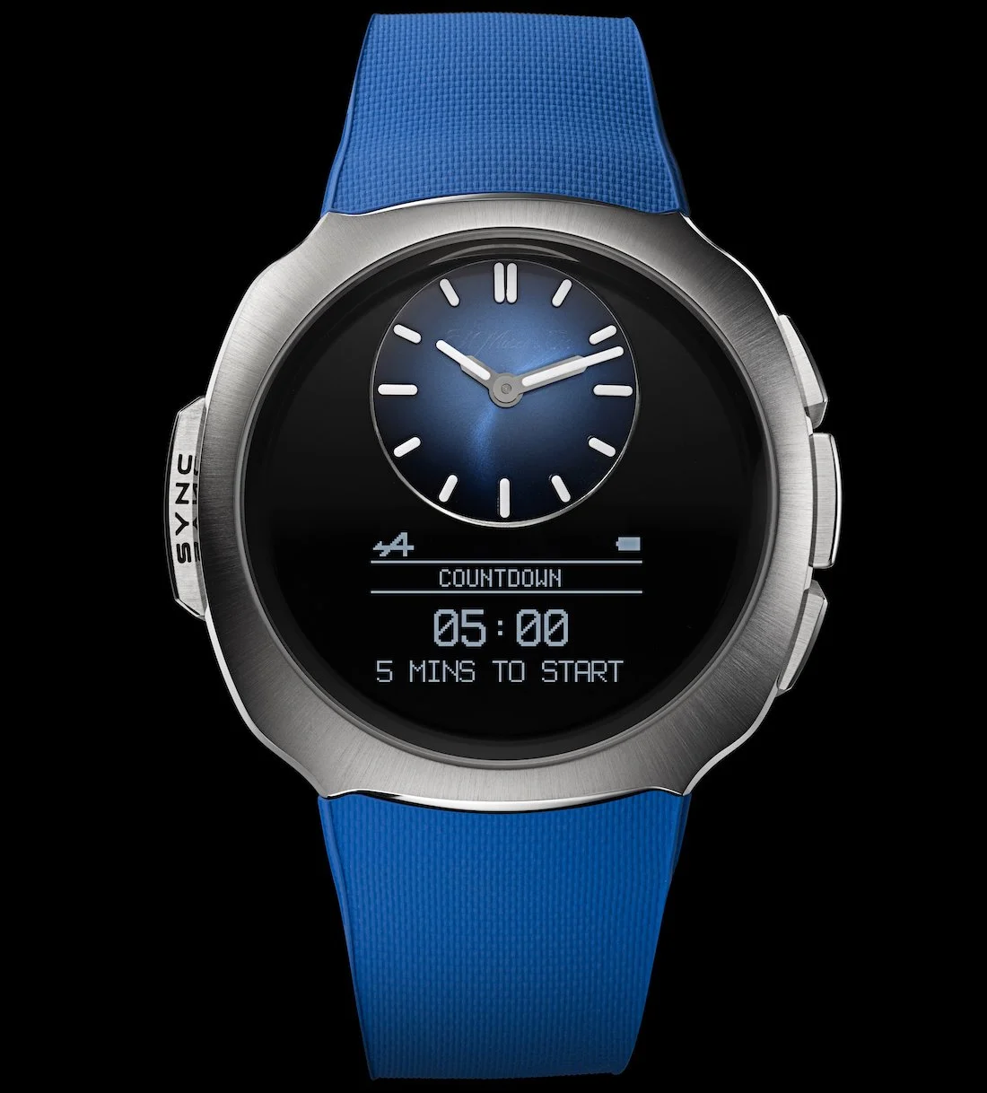 Yet it maintains classical elements with a small domed Funky Blue fumé dial displaying traditional time and date functions, proving precision and style can coexist. The timepiece operates autonomously while syncing via Bluetooth when needed via a SYNC push button at 9 o’clock, with remarkable endurance: one year in time-only mode, and six Grand Prix weekends in connected mode.