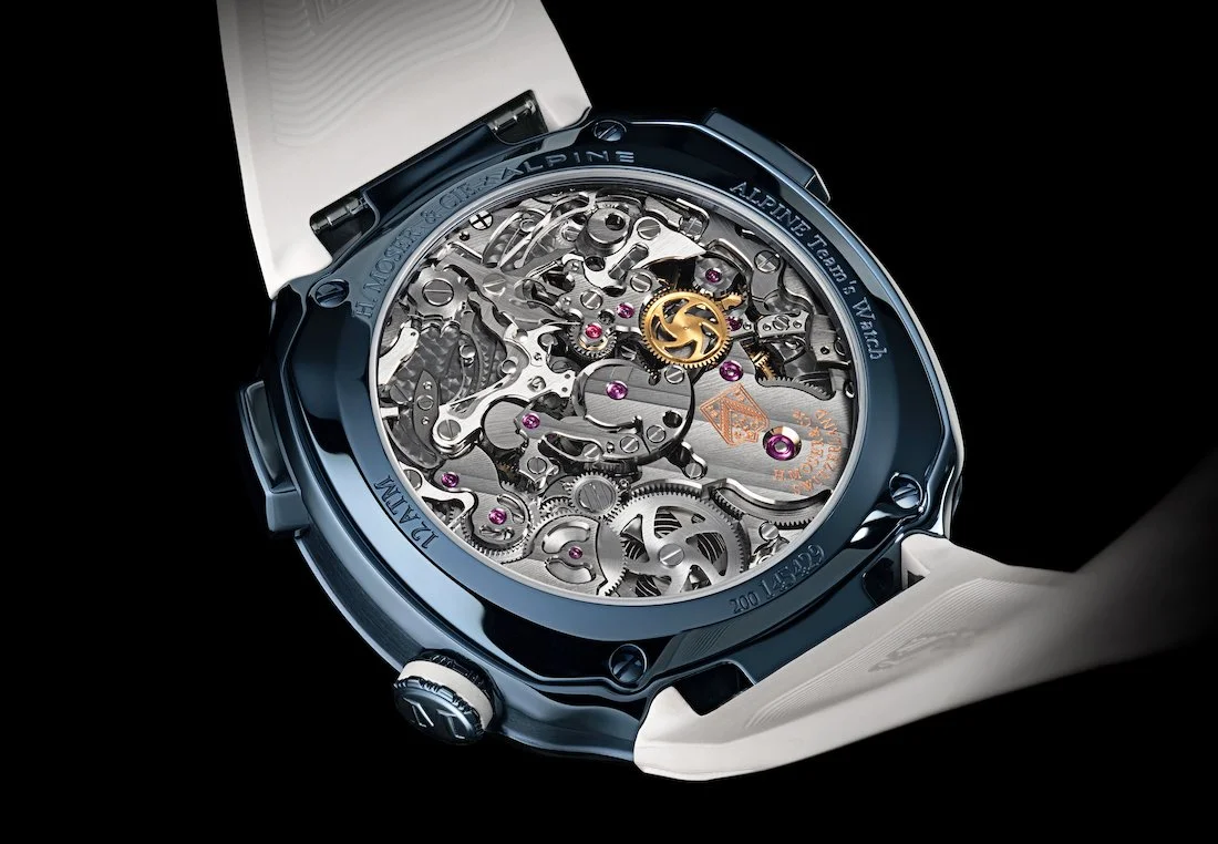The watch's aesthetic directly reflects racing DNA. Two visible bridges form V-shapes that mirror single-seater suspension geometry, while the central bridge resembles a driver's helmet—honoring those who risk everything on the track. The skeleton rotor echoes Alpine A110 wheel rim dynamics, creating visual harmony between automotive and horological engineering with every rotation.