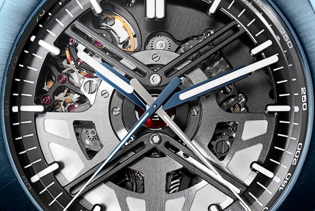 The new H. Moser & Cie. Alpine Drivers Edition is powered by the Calibre HMC 700 developed with AGENHOR for H. Moser & Cie., a fully skeletonized automatic movement with skeletonised tungsten oscillating weight, positioned between the movement and the dial, a double barrel, a column wheel chronograph with two-stage chronograph mechanism and horizontal clutch with friction wheel. The movement is composed of 434 parts and provides a minimum power reserve of 72 hours.
