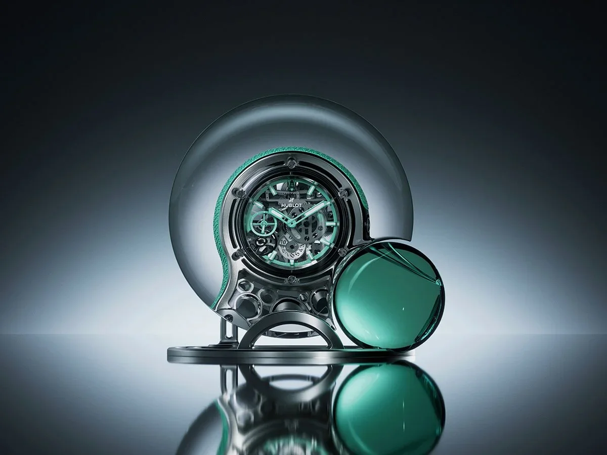 Following the success of last year's MP-16 Arsham Droplet pocket watch, Hublot and artist Daniel Arsham return with the MP-17 Meca-10 Arsham Splash Titanium Sapphire, marking Arsham's first wristwatch design for the brand. This collaboration translates the kinetic moment of water meeting the surface into a 42 mm sculptural timepiece that showcases Hublot's mastery of sapphire crystal engineering and its newly downsized Meca-10 movement, available in a limited edition of only 99 pieces. For reference, below is the Hublot Arsham Droplet pocket watch.