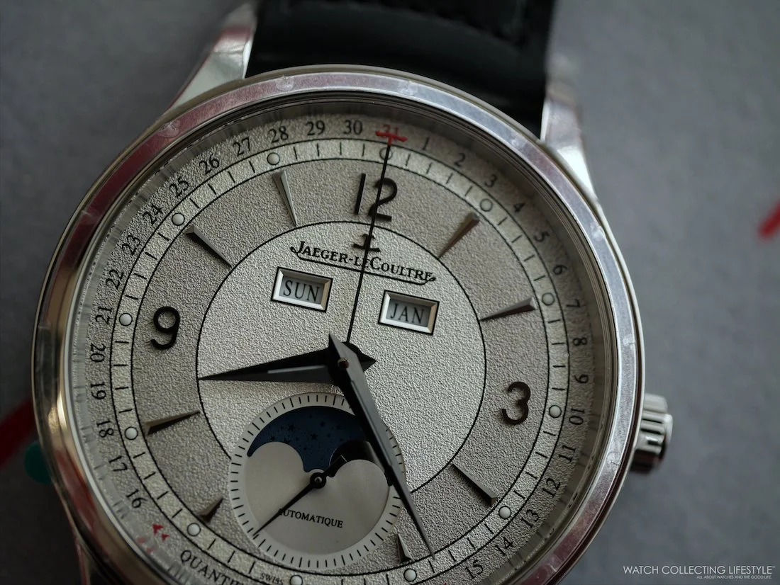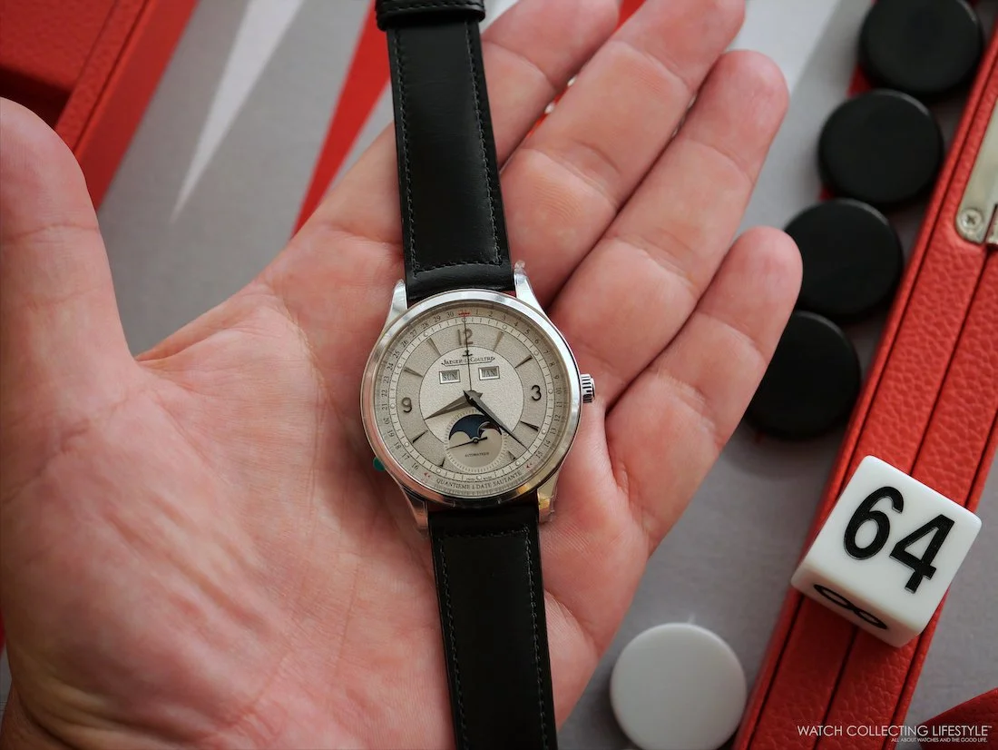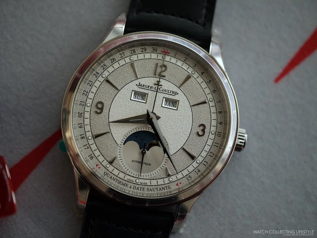 At 40 mm, this Master Control Calendar wears exceptionally well. On my 7.5-inch wrist, it felt perfectly proportioned. The stainless steel case features polished bezels and lug tops that catch light nicely, while brushed case sides prevent it from looking too formal. You can wear this watch to business meetings, casual weekend outings, and a semi-formal dinners. The two-tone grey dial proved remarkably versatile—more contemporary than traditional white or silver dials, yet maintaining enough classical restraint for professional settings.