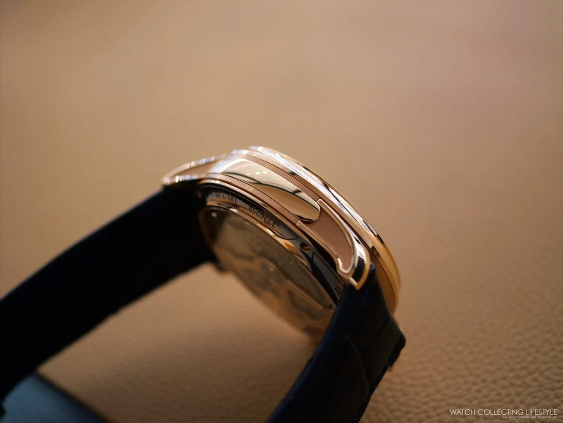 For all its mechanical intricacy, the Calibre 948 movement inside this timepiece has been engineered for straightforward user interaction. Time adjustment occurs via the crown, which coordinates all worldwide time zones simultaneously. Upon reaching a different destination, the wearer adjusts their local hour using that same crown, which advances or reverses only the hour indicator in single-hour increments. Comprising more than 40 parts, the case, with its convex bezel, contrasts with broad bevels on the lugs and hollowed-out lug sides. The case displays mirror-finish polishing across most surfaces, except the hollowed-out areas of the caseband adjacent to the lugs on each side, which receive a micro-blasted treatment.