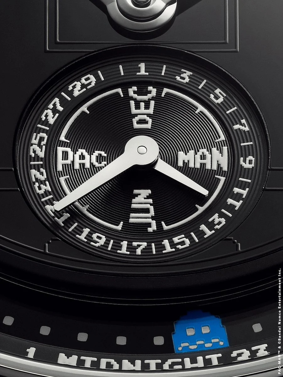 The aesthetic stays true to the original 1980’s arcade game. The maze is rendered in translucent tampography on the polished onyx dial, visible only when light hits at a precise angle. Ghosts and fruit are hand-painted, and all typography adopts the pixelated lettering of the arcade era. Each of the 15 pieces varies in ghost positioning and fruit arrangement, making every watch a unique composition.