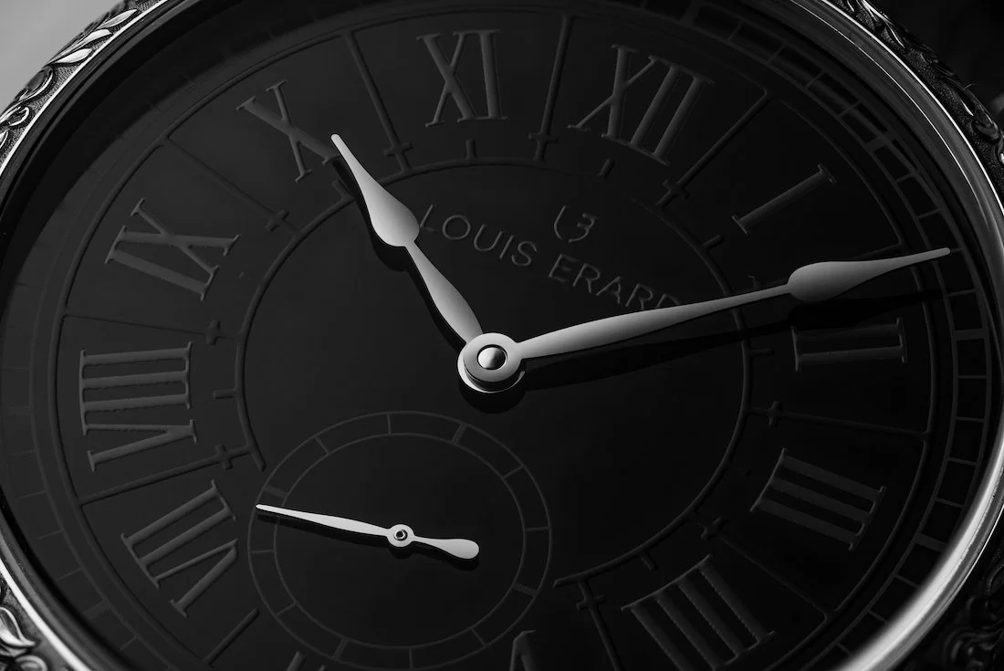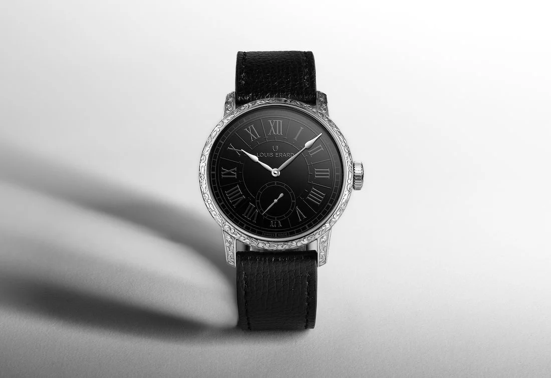 Louis Erard's characteristically clean architecture serves as the foundation for this ornate baroque ornamentation, which extends seamlessly to the dial itself, which maintains deliberate restraint through its glossy black lacquer finish, accented with subtle anthracite and black transferred details that complement rather than compete with the case's elaborate engraving.