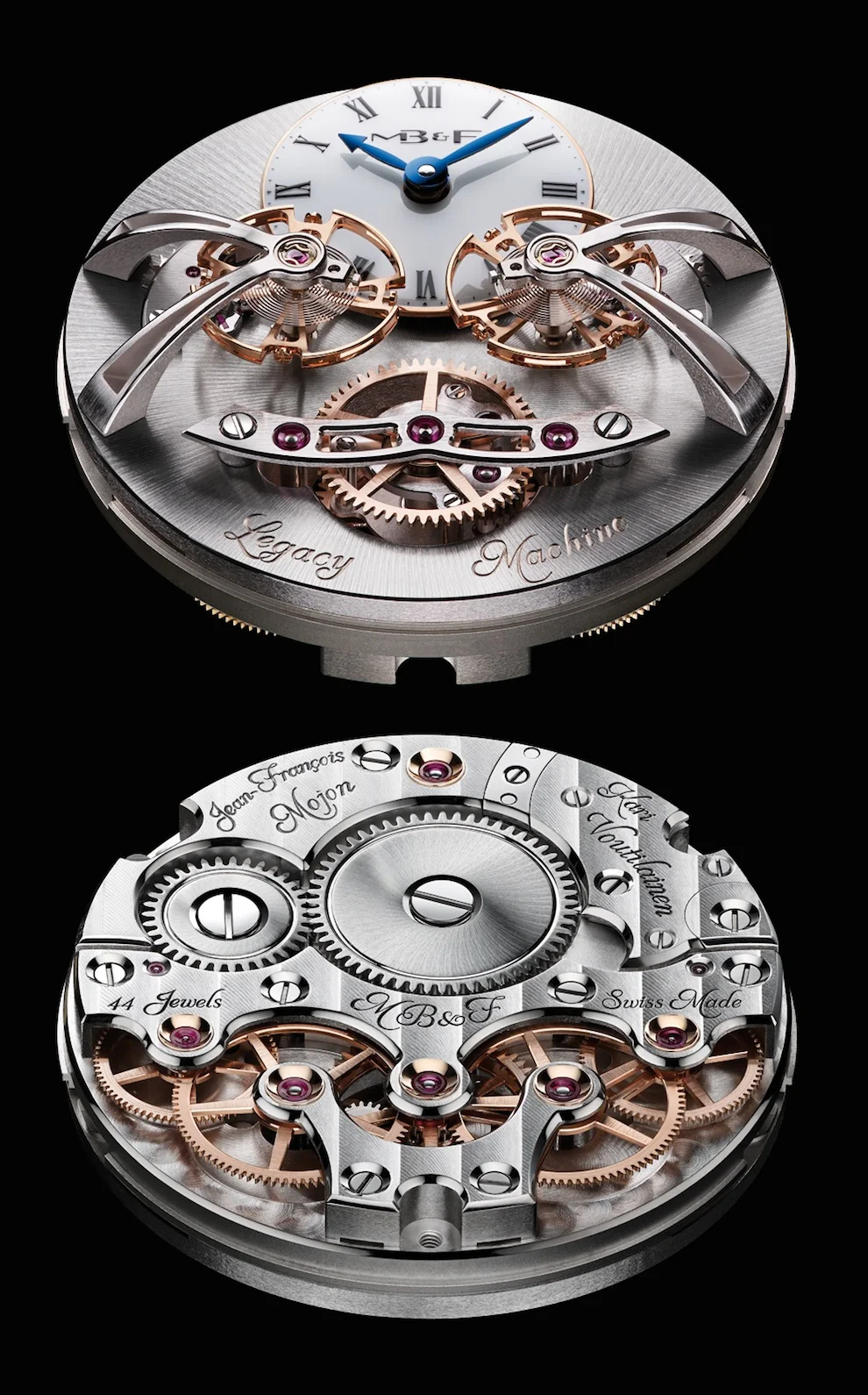 The movement of Legacy Machine No. 2 was developed to MB&F’s specifications by award-winning watchmaker Jean-François Mojon —Best Watchmaker at the 2010 Grand Prix d’Horlogerie de Genève— and his team at Chronode. Acclaimed independent watchmaker Kari Voutilainen ensured that the movement’s aesthetic style was consistent with high-quality traditional timepieces of the 19th century and for specifying the superlative hand-finishing. Immaculate Geneva waves, gold chatons, mirror-polished bevels and bridges designed with deliberate internal bevelled angles —which cannot be finished by machine— showcase the movement’s peerless fine finishing. Consistent with MB&F’s spirit of transparency, the names of the two men responsible for the movement are hand engraved on the back.