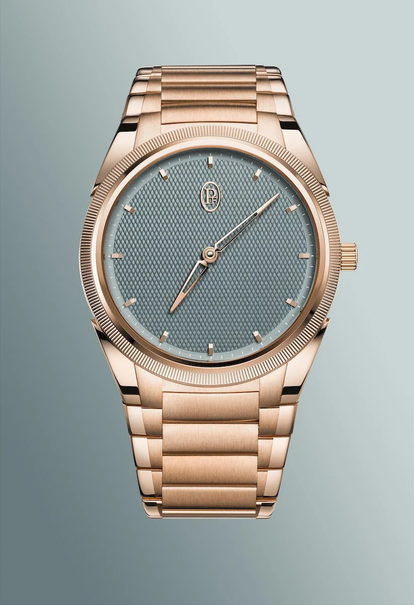 Both watches share the same 40 mm case, at 7.8 mm thick, the material distinction between the two models is more than cosmetic. In stainless steel ref. PFC914-1020023-100182, the Agave Blue dial reads cooler, more architectural, while the platinum bezel reinforces a contemporary severity. In 18K rose gold ref. PFC914-2020023-200182, the same dial warms considerably, the guilloché catching light with a richness that softens the overall character. Applied indices shift accordingly: rhodium-plated steel in the steel variant, 18K rose gold in the precious metal variant, and skeletonized delta-shaped hands that have become one of the Tonda PF's most recognizable details.