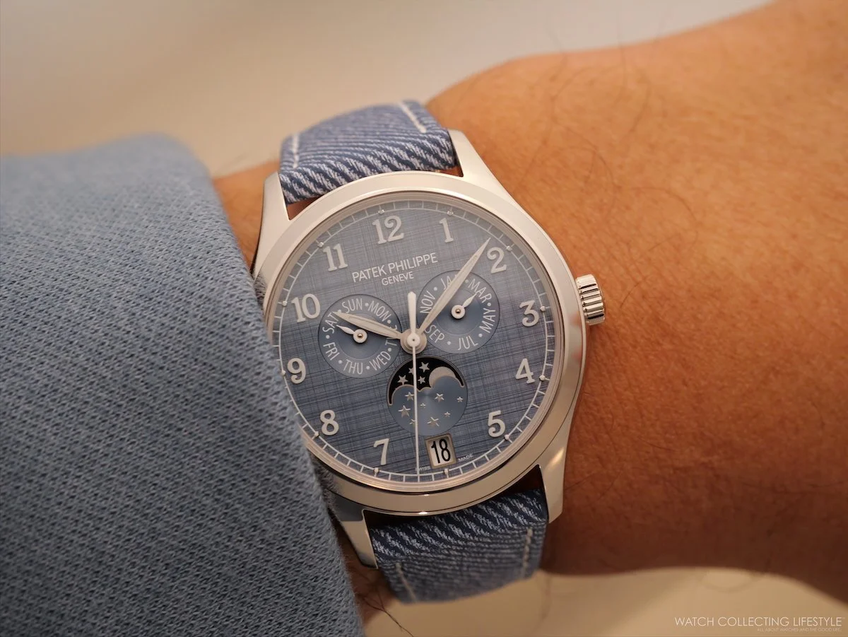 The Patek Philippe 4946G-001 is an annual calendar for a collector who wants the complication but finds the traditional presentation too conservative. The ‘shantung’ textured dial gives it a personality that earns repeat attention, and the strap coordination is handled with enough restraint to stay on the right side of the concept. The dial appears like a piece of linen fabric to the naked eye more than a piece of raw silk.