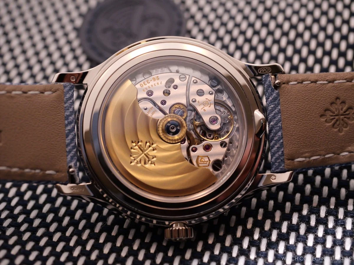 Powering this watch is the calibre 26-330 S QA LU, an automatic movement with a 21K gold central rotor. Composed of 319 parts and 34 jewels, it delivers a power reserve of 35 to 45 hours. Like all of Patek's annual calendar movements, it requires only one correction per year—at the end of February.