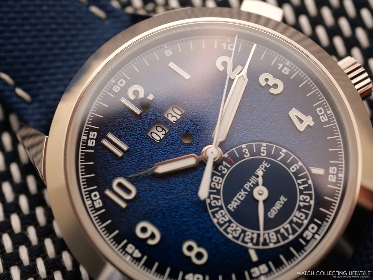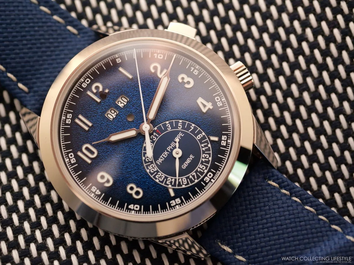 The 5322G-001 is cloaked in a textured, lacquered navy-blue dial with a black-gradient rim; applied white-gold numerals and syringe-shaped hands feature a luminescent coating; the date is displayed in a subdial at 6 o'clock, and a double aperture at 12 o’clock displays the time that the alarm is set for, with a small round aperture underneath display whether it is on or off.