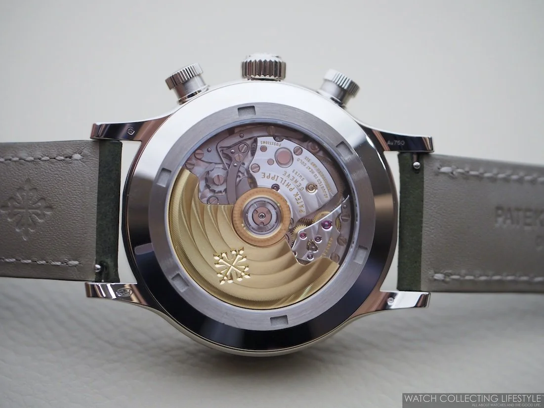 The new Patek Philippe Calatrava Pilot Travel Time Chronographs ref. 5924G are powered by the automatic calibre CH 28‑520 C FUS with flyback central chronograph, 60-minute counter, two time zones and day/night indication. This 370-part movement is fully visible via the display case back and it provides a power reserve of 55 hours while beating at a frequency of 28,800 vph.