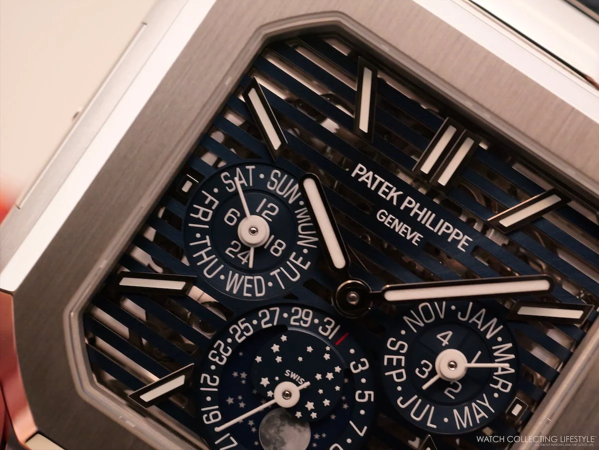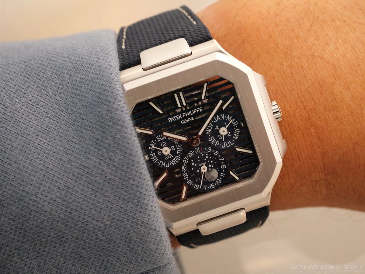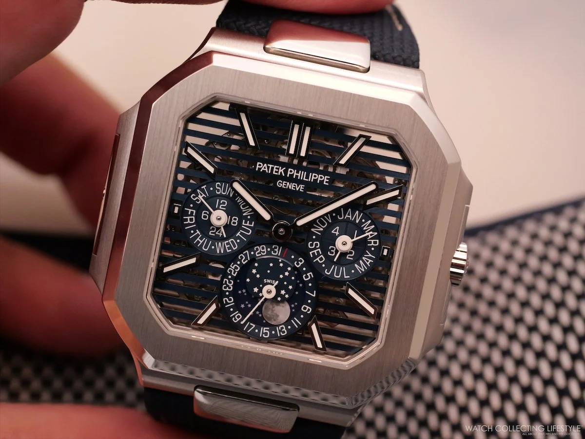 On the wrist, the new Cubitus ref. 5840P-001 is what collectors have been waiting for since the Cubitus launched: a complications proposition that matches the case's ambition with a movement that matches the case shape, and not an afterthought with a round movement in a square case.