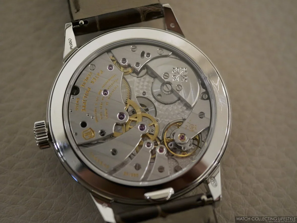 Caliber 31-260 PS QL is a self-winding movement measuring 34mm in diameter and 5.8mm thick — thin enough that the 5236 remains wearable despite its complication count. The platinum off-center minirotor winds efficiently while staying clear of the dial-side architecture. With 503 parts, 55 jewels, a Gyromax balance, and a Spiromax spring oscillating at 4 Hz, the caliber delivers between 38 and 48 hours of power reserve. It carries the Patek Philippe Seal.