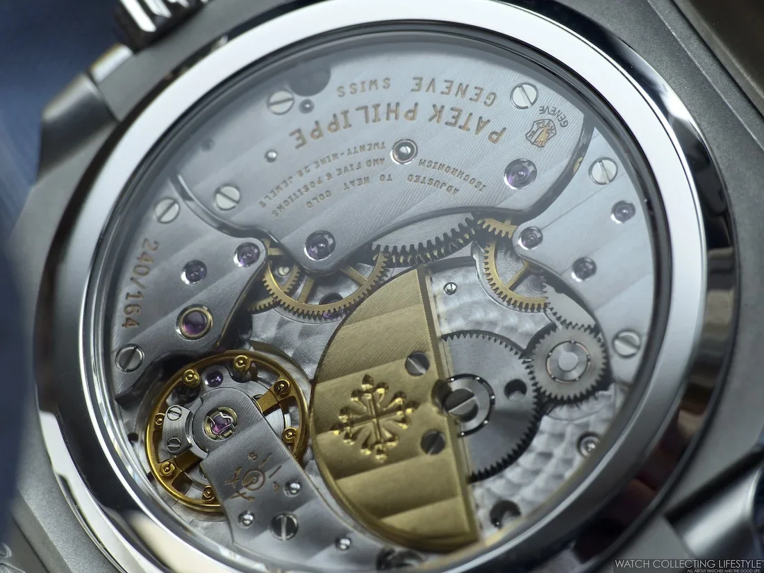 The suffix PS IRM C LU tells the rest: Petite Seconde, Indicateur de Réserve de Marche, Calendrier, and Lune. Despite this complication load, the complete movement measures only 3.88 mm in height—a figure that borders on the absurd for what it delivers. Patek Philippe chose to build outward from the calibre 240—a movement conceived for dress watches—and prove that complications and sports-watch proportions were not mutually exclusive.