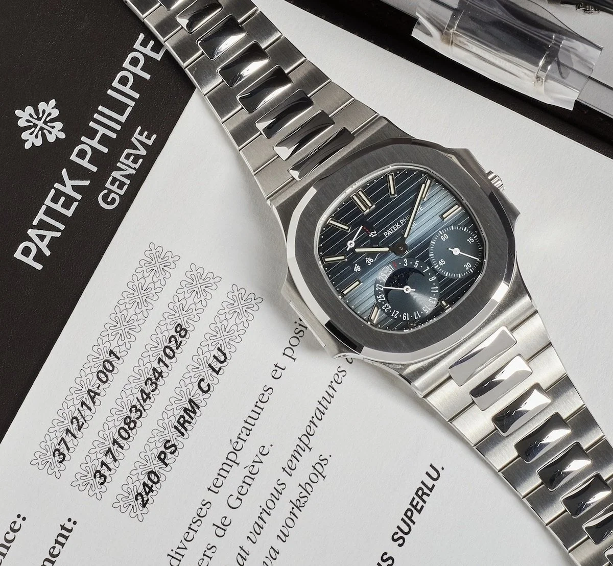 The ref. 5712/1A-001 in stainless steel, with its blue-black gradient dial, was the icon—the version that appeared on waiting lists, launched a thousand "if I could only own one Patek" conversations, and after its discontinuation in January 2021, saw secondary market prices surge to multiples of retail.