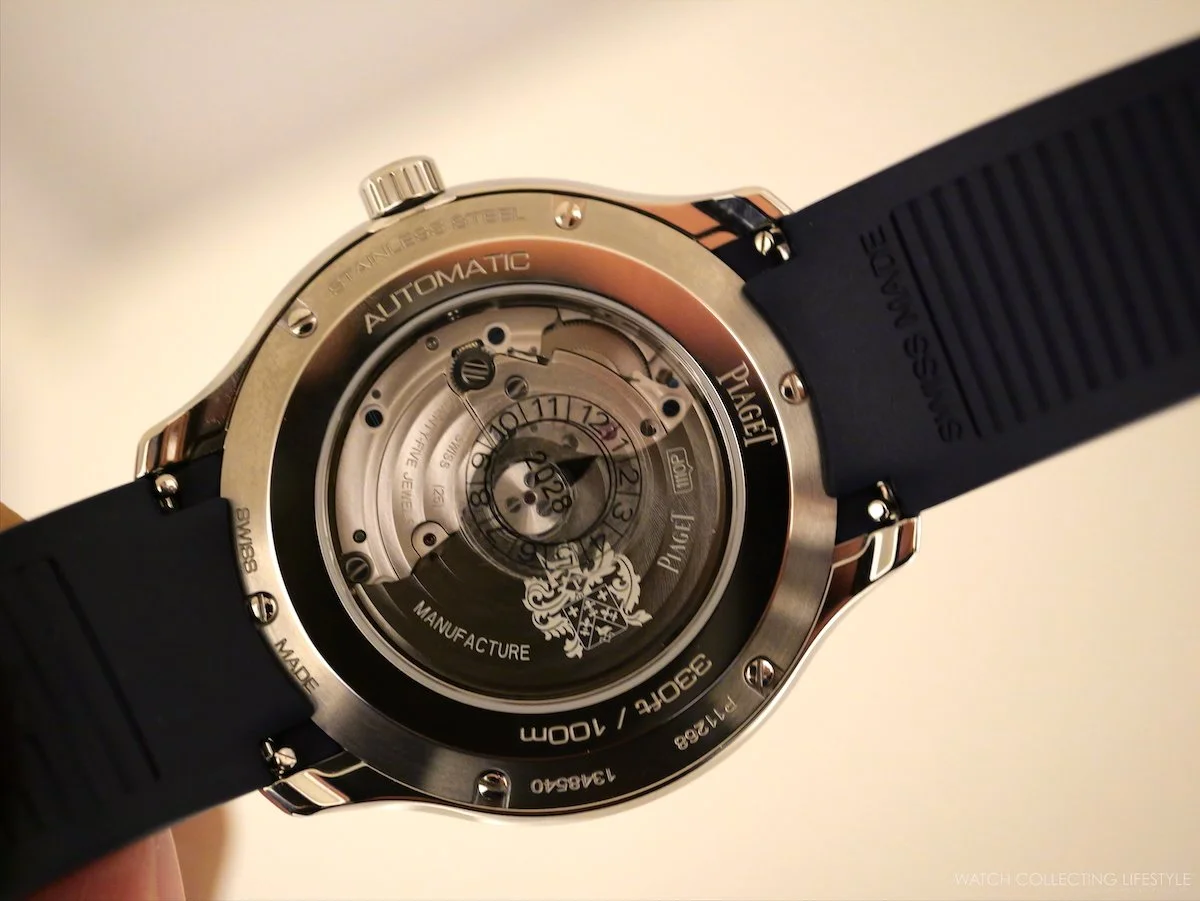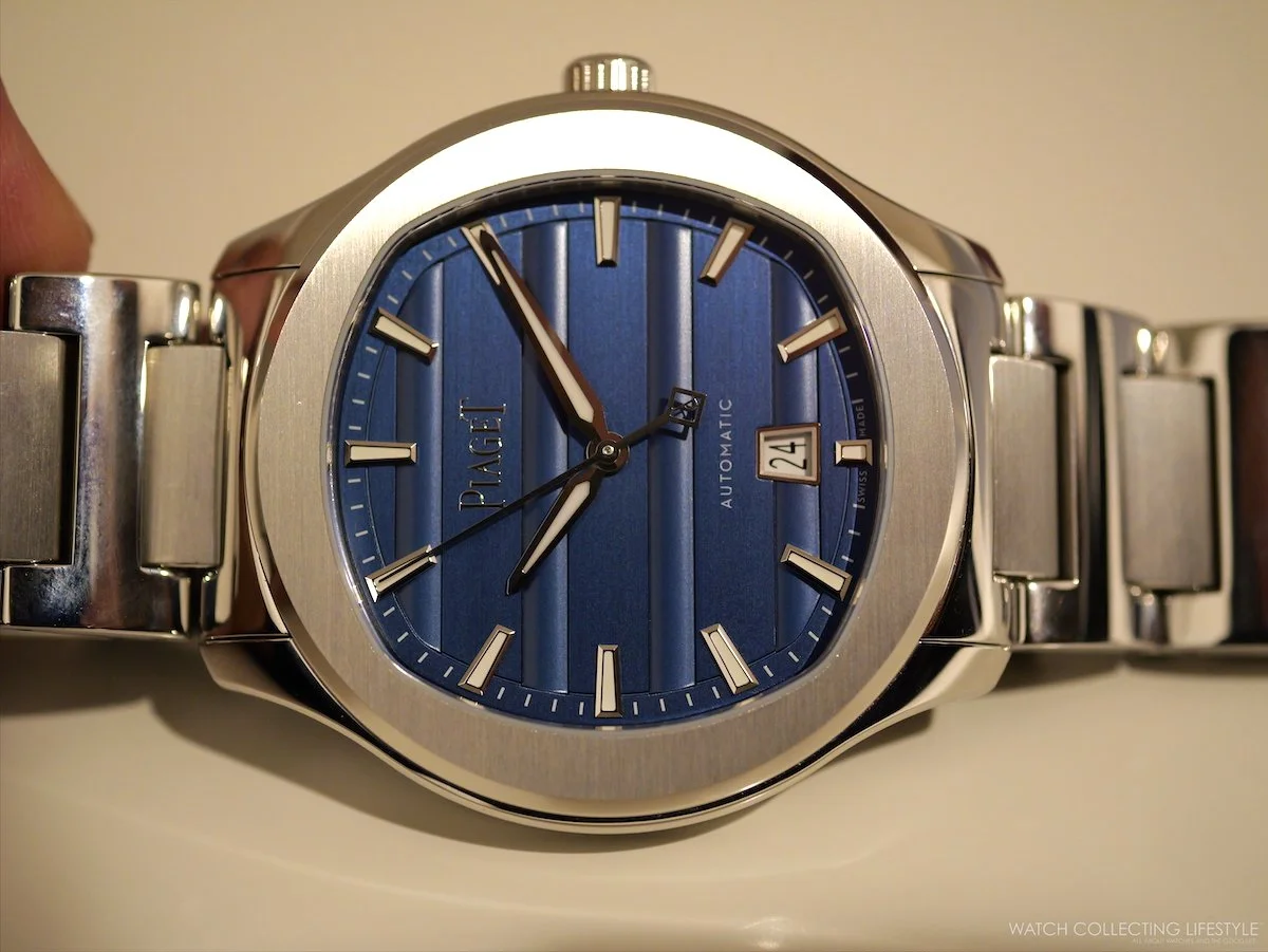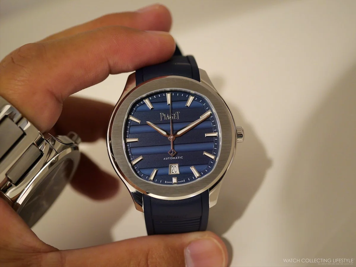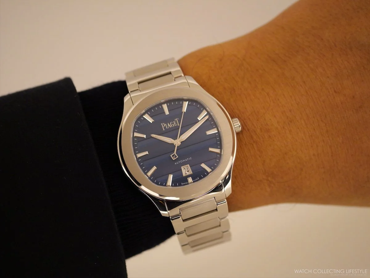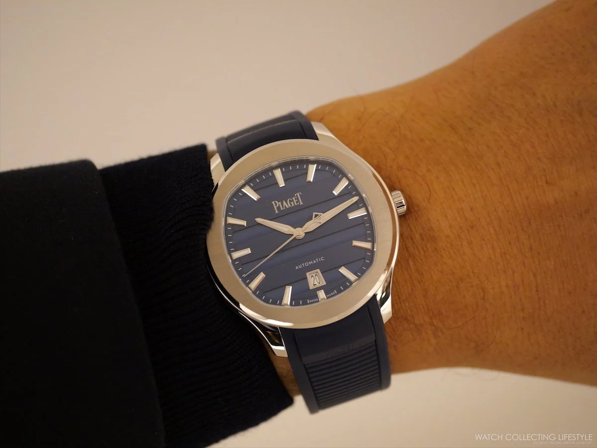 The Polo Signature Date 42 wears with the ease of a well-resolved sports watch, substantial without bulk, the integrated bracelet option drawing the case into a seamless whole. Piaget delivers the bracelet configuration with an additional blue rubber strap included in the box, offering two distinct registers from a single purchase: dressed and casual. The rubber strap references are the natural entry point, pairing the gadroon dial with a more relaxed wearing experience and genuine versatility. Definitely going with the stainless steel bracelet reference is a much better proposition.
