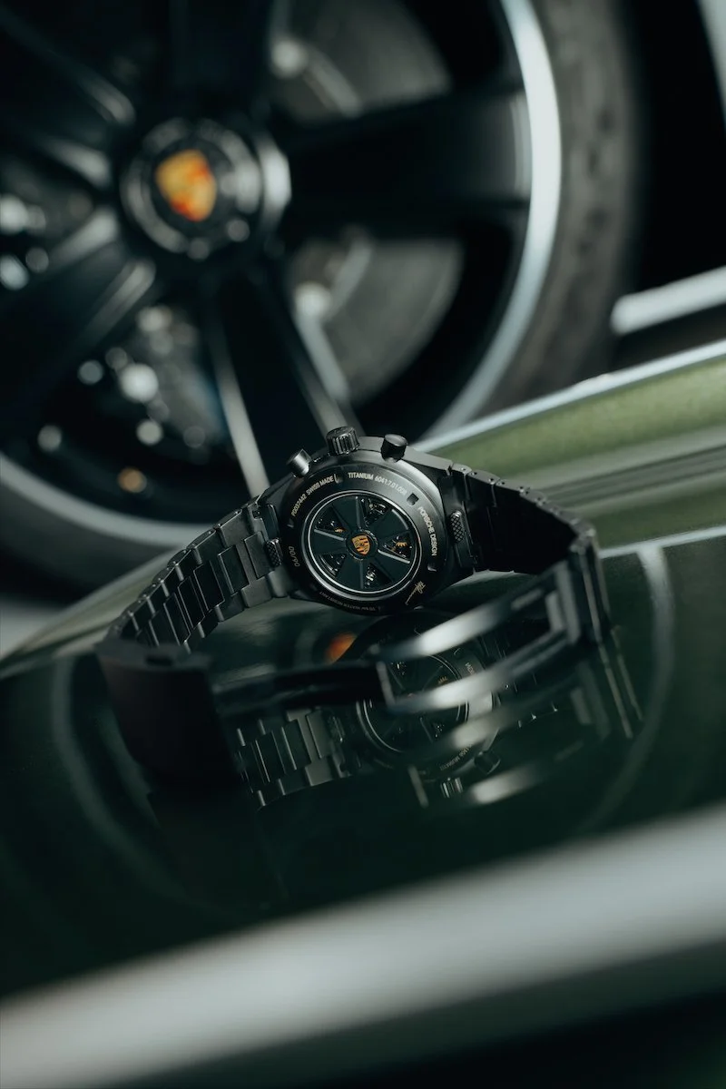 The 42 mm case departs from its 1972 ancestor with contemporary materials—ultra-lightweight, hypoallergenic titanium —while retaining the iconic black coating that defined the world's first entirely black timepiece. Porsche Design's Grenchen manufactory has equipped the COSC-certified automatic movement with a rotor that mirrors the shape and color of the Sport Classic wheels fitted to the GT3.