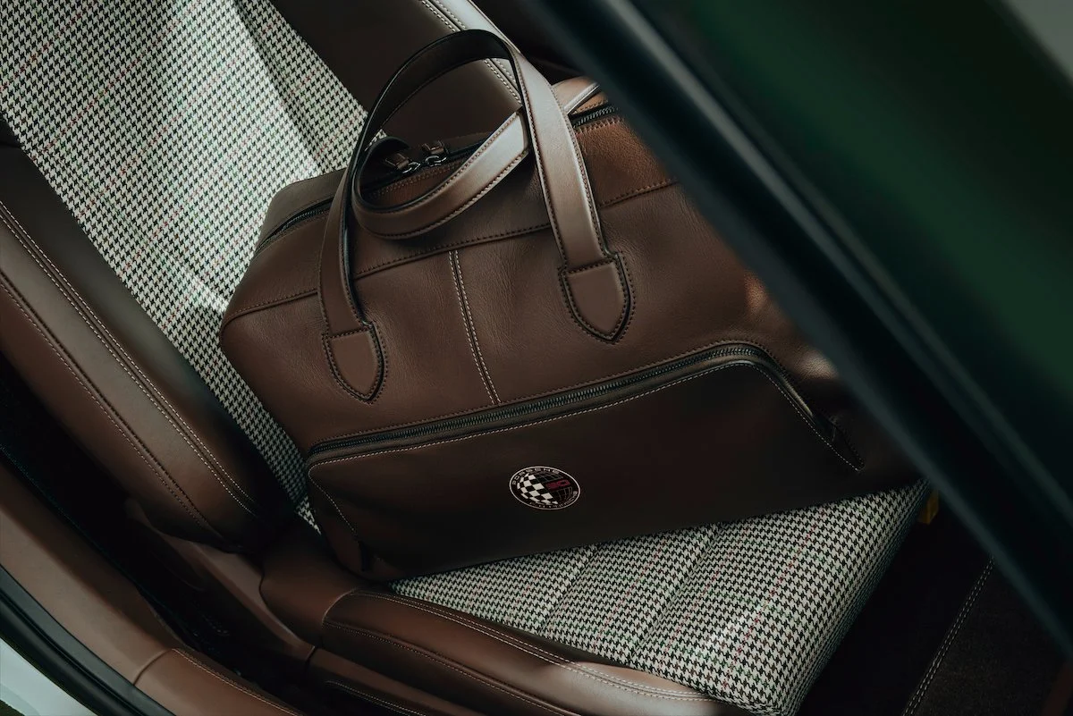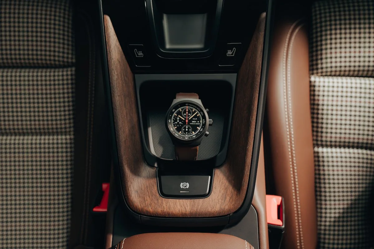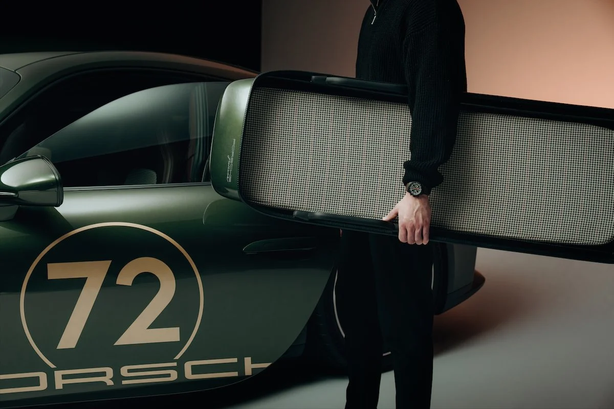 Inside, the F.A. Grid-Weave pattern—inspired by Professor Porsche's favorite checkered jackets—appears on the seat centers, glove compartment, and trunk mat, matched with Truffle Brown Club Leather and Chalk Beige stitching that extends to the timepiece's leather strap. Each of the 90 examples pairs the Chronograph 1 with the matching Weekender bag, creating a cohesive collection celebrating functional design across automotive and horological disciplines. The car features a gold-plated rectangular medallion bearing the inscription “ONE of 90”, mounted on one of the wood accents of the dashboard.