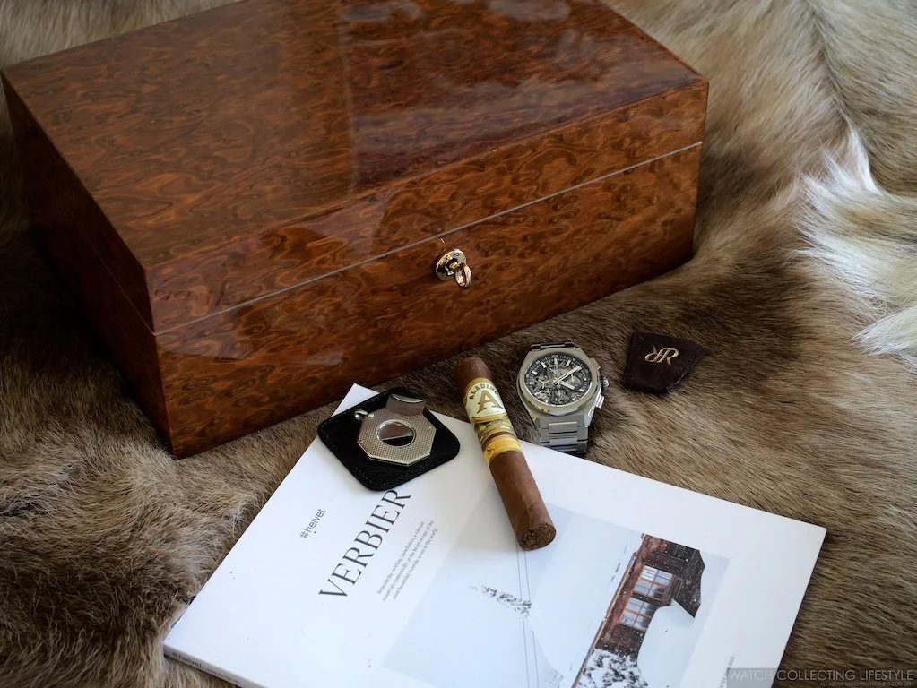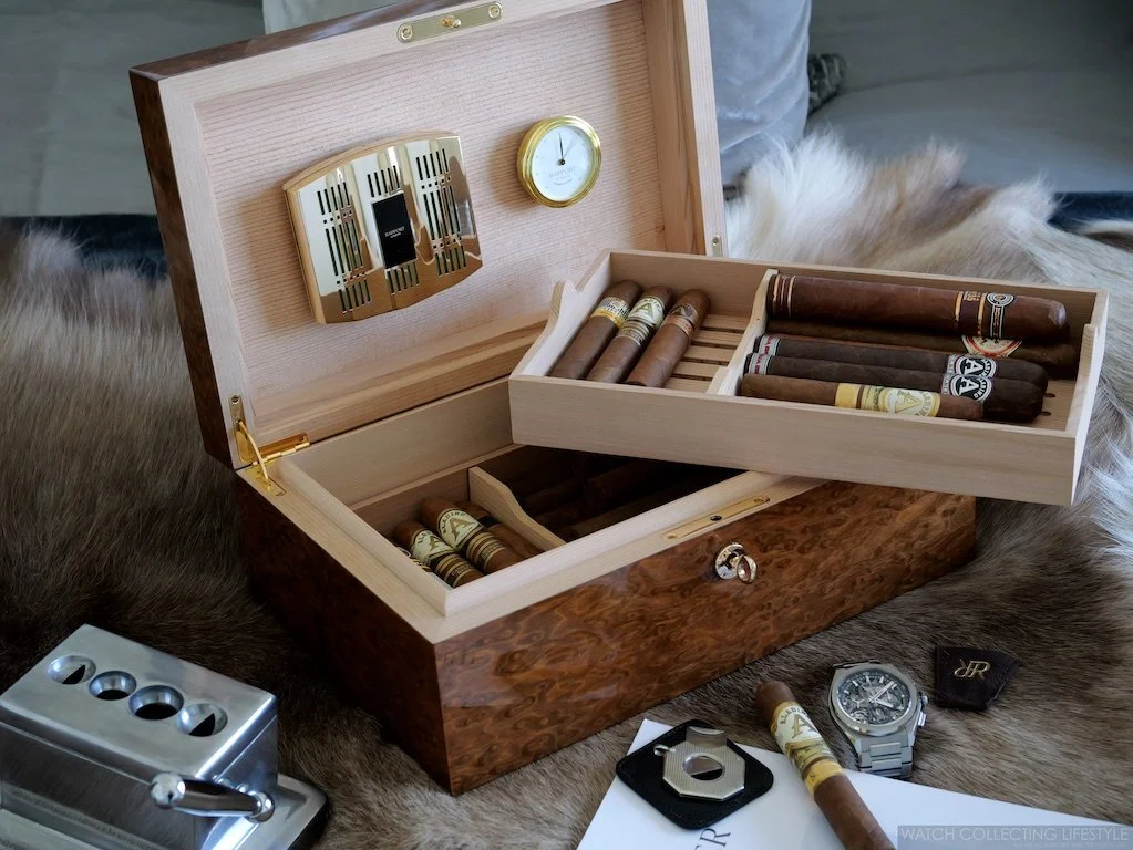 In the thin air of Verbier or the hot air of Texas, where every breath is precious, Rapport London ensures that every draw is worthy of the altitude, the setting, and the moment itself. This is more than storage—it's stewardship. More than preservation—it's the continuation of a proud British tradition of excellence in luxury accessories. The Rapport London Heritage Humidor is available in three different sizes and also in black or brown leather. For us, the beauty of the Burr Walnut has no comparison.
